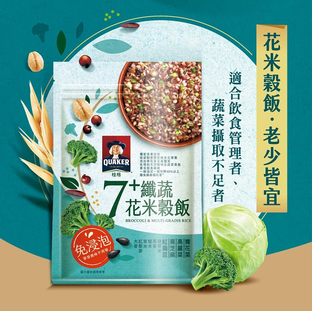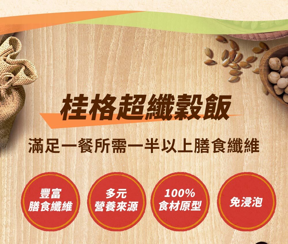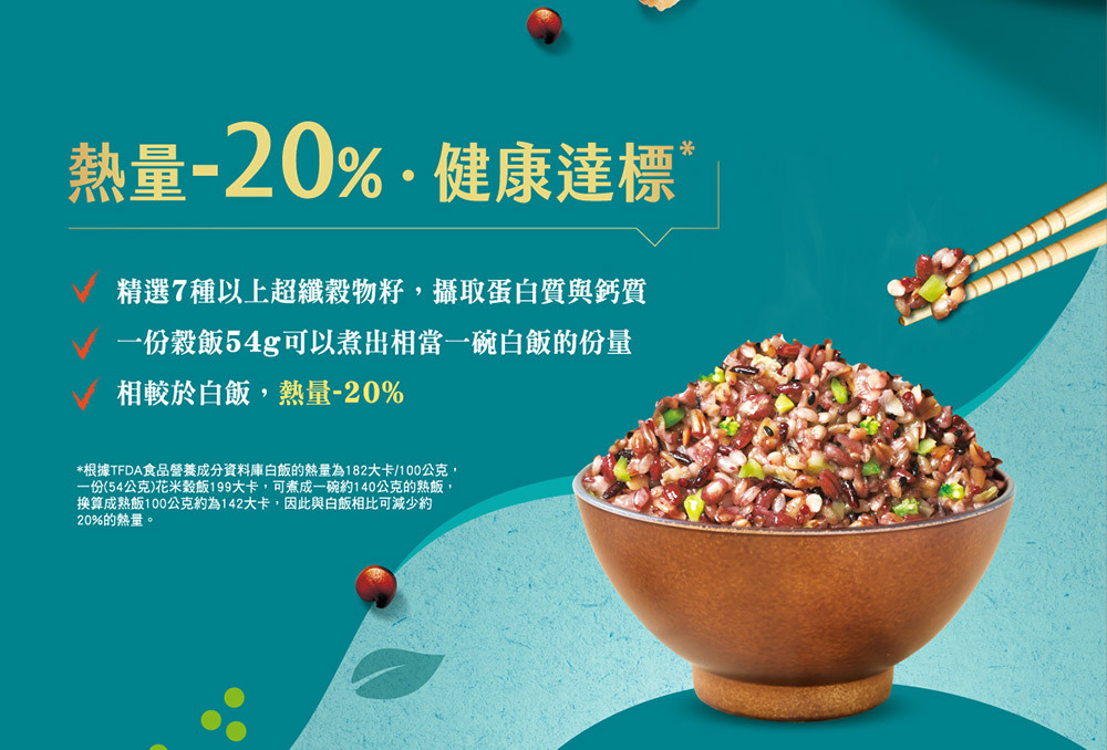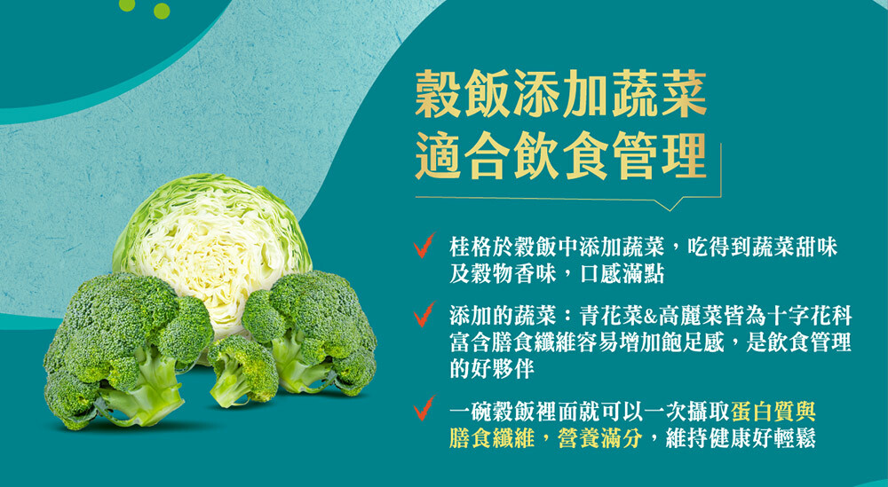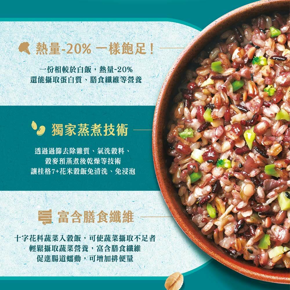 | 成分/內容物 | 7+纖蔬花米穀飯:燕麥(台灣)、糙米(台灣)、大麥(澳洲)、高麗菜(高麗菜、葡萄糖)(中國)、紅扁豆(加拿大)、紫米(台灣)、黑芝麻(台灣)、紅藜麥(秘魯)、青花菜(青花菜、葡萄糖)(中國)、發芽米(台灣)。5+超纖穀飯:燕麥(台灣)、糙米(台灣)、大麥(澳洲)、紫米(台灣)、亞麻仁籽(烏克蘭/加拿大)、蕎麥(俄羅斯/烏克蘭)、紅藜麥(祕魯)、發芽米(台灣)。10超纖穀豆飯:燕麥(台灣)、糙米(台灣)、鷹嘴豆(美國)、大麥(澳洲)、蕎麥(俄羅斯/烏克蘭)、紫米(台灣)、紅扁豆(加拿大)、亞麻仁籽(烏克蘭/加拿大)、黑芝麻(台灣)、紅藜麥(祕魯)、發芽米(台灣)。 |