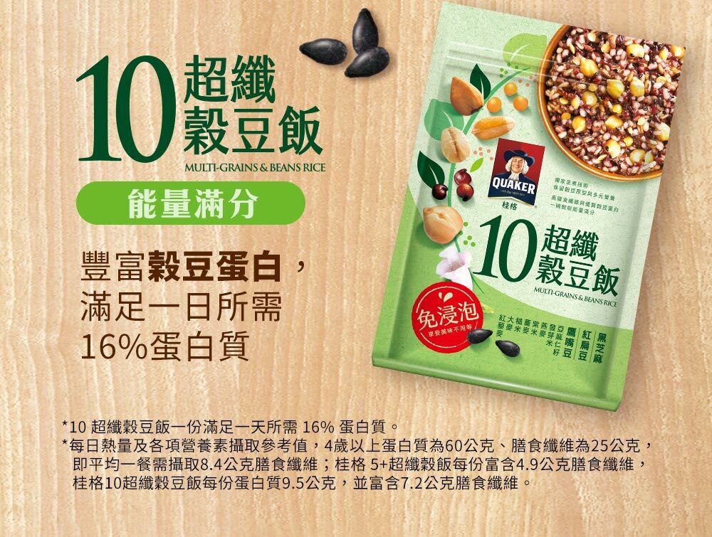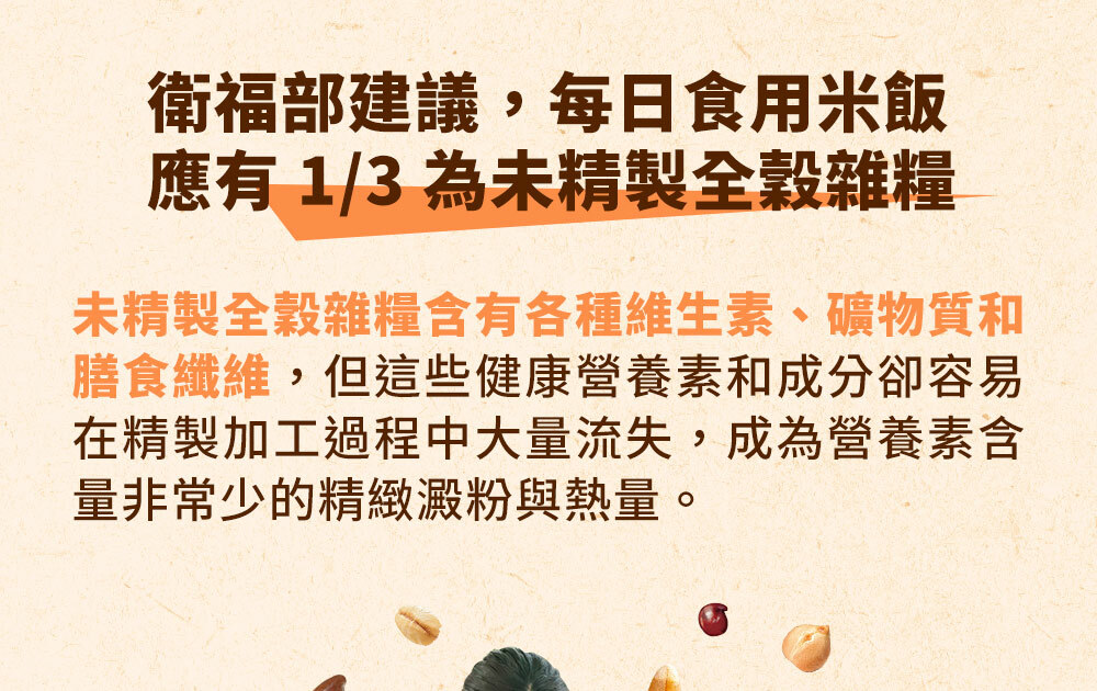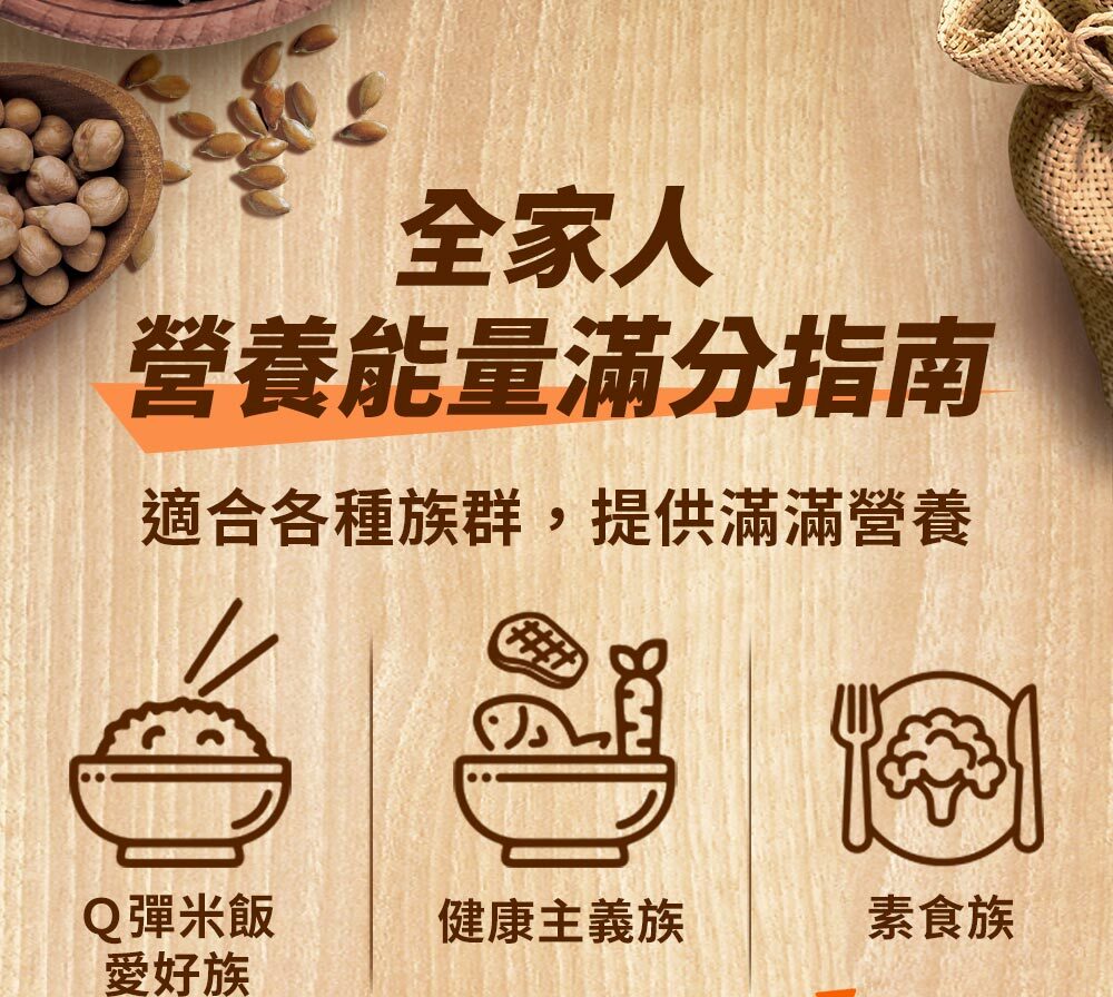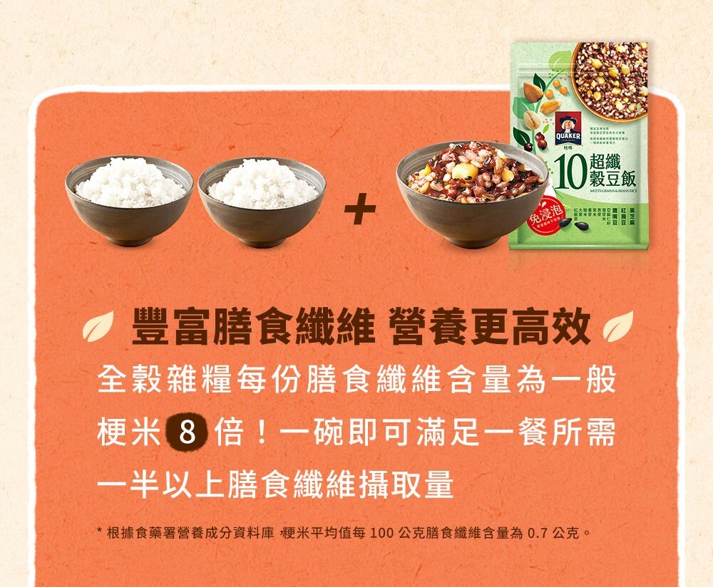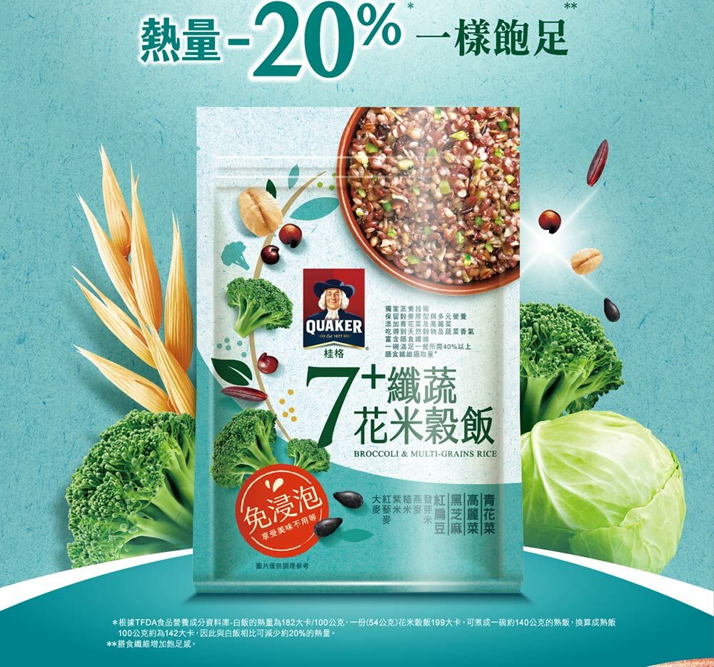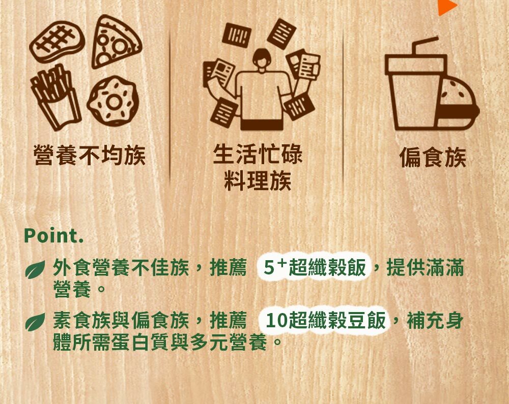 | 成分/內容物 | 7+纖蔬花米穀飯:燕麥(台灣)、糙米(台灣)、大麥(澳洲)、高麗菜(高麗菜、葡萄糖)(中國)、紅扁豆(加拿大)、紫米(台灣)、黑芝麻(台灣)、紅藜麥(秘魯)、青花菜(青花菜、葡萄糖)(中國)、發芽米(台灣)。5+超纖穀飯:燕麥(台灣)、糙米(台灣)、大麥(澳洲)、紫米(台灣)、亞麻仁籽(烏克蘭/加拿大)、蕎麥(俄羅斯/烏克蘭)、紅藜麥(祕魯)、發芽米(台灣)。10超纖穀豆飯:燕麥(台灣)、糙米(台灣)、鷹嘴豆(美國)、大麥(澳洲)、蕎麥(俄羅斯/烏克蘭)、紫米(台灣)、紅扁豆(加拿大)、亞麻仁籽(烏克蘭/加拿大)、黑芝麻(台灣)、紅藜麥(祕魯)、發芽米(台灣)。 |