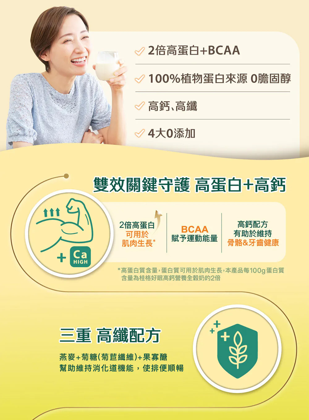 .100%植物蛋白來源,2 倍植物高蛋白,雙重膳食纖維,高鈣配方。