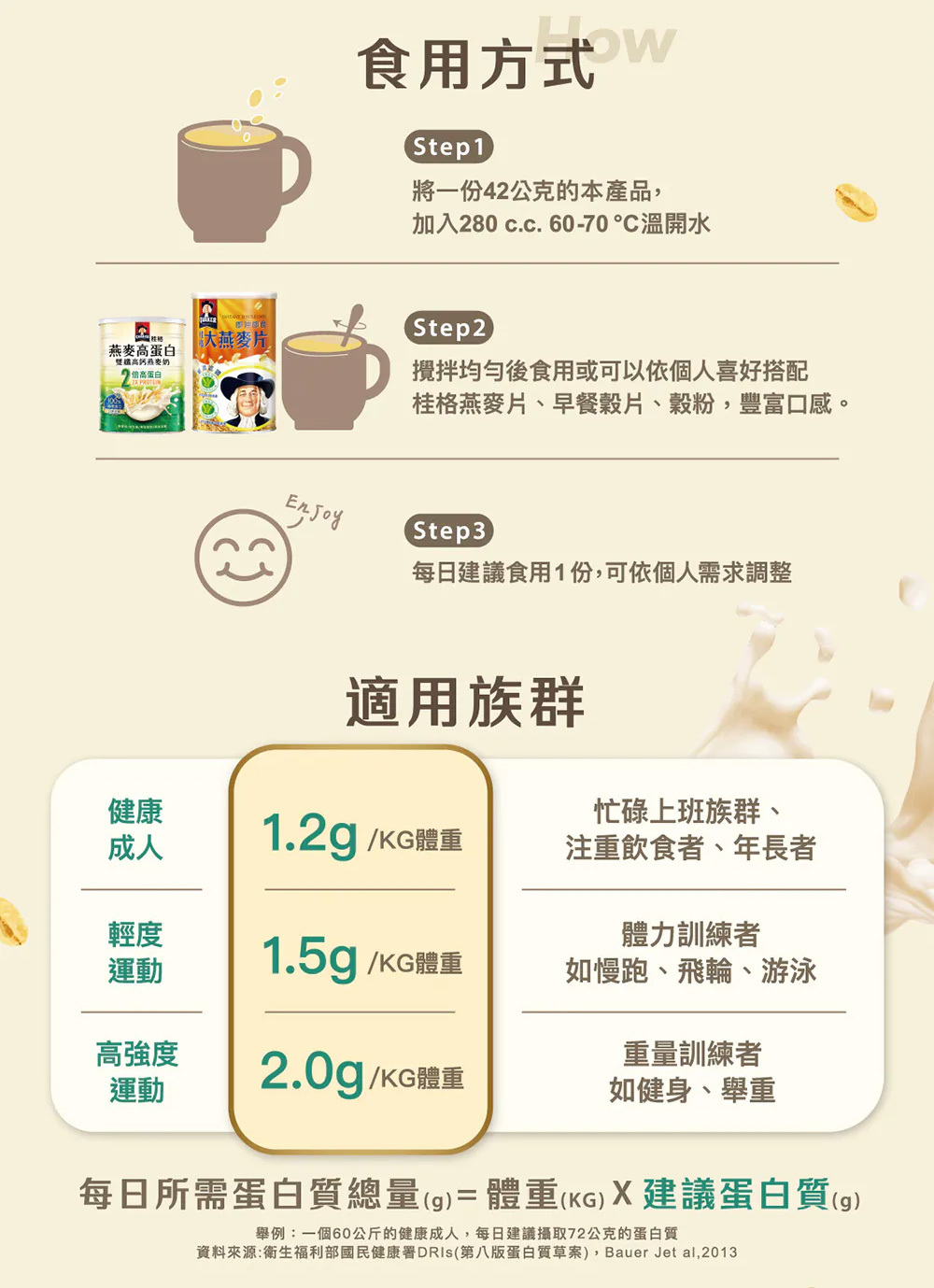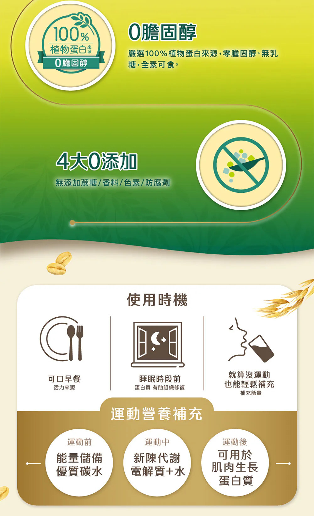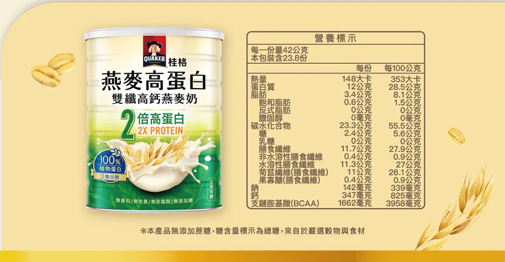 | 成分/內容物 | 植物蛋白粉[燕麥粉(含燕麥蛋白), 大豆蛋白],綜合纖維[菊糖(菊苣纖維)、果寡醣],綜合穀豆粉(金黃豆漿粉、黃豆粉、烤焙小麥粉),碳鈣,食鹽 |