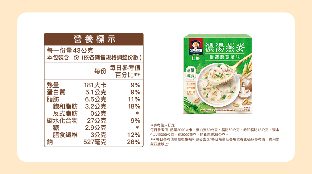 | 成分/內容物 | 大燕麥片、什錦蔬菜(馬鈴薯、蘑菇、菠菜、洋香菜葉(巴西里葉))、非氫化棕櫚仁油、蔗糖、乳脂粉(乳脂、脫脂乳粉)、燕麥、分離大豆蛋白、小麥纖維、酵母抽出物、食鹽、乳清粉、香料、關華豆膠、調味劑(5’-次黃嘌呤核苷磷酸二鈉、5’-鳥嘌呤核苷磷酸二鈉)、白胡椒粉、維生素E-抗氧化劑。 |