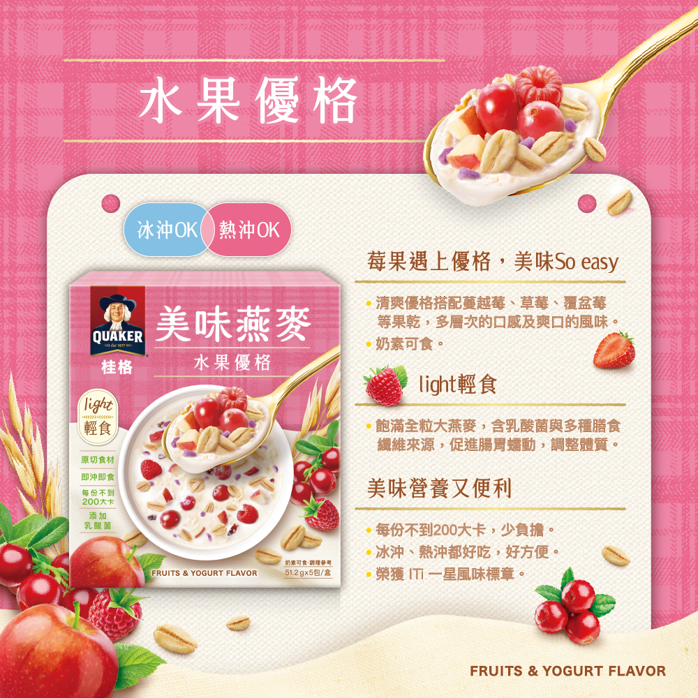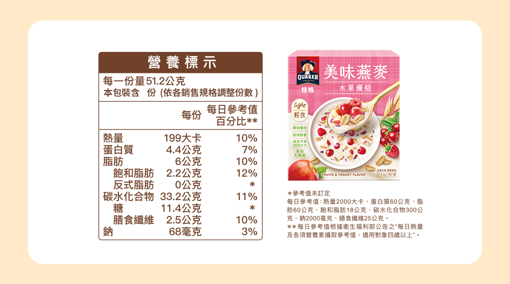 | 成分/內容物 | 大燕麥片、蔗糖、優格預混粉[脫脂奶粉、優格粉(玉米澱粉、優格、葡萄糖、乳糖)、碳酸鈣、芽孢乳酸菌(Bacillus coagulans)]、麥芽糊精、綜合水果[蔓越莓、蘋果、草莓、蔓越莓果汁粉(蔗糖、麥芽糊精、曼越莓濃縮汁、紅甜菜汁)、覆盆莓、紫薯]、非氫化棕櫚仁油、香料、乳清粉、食鹽。 |