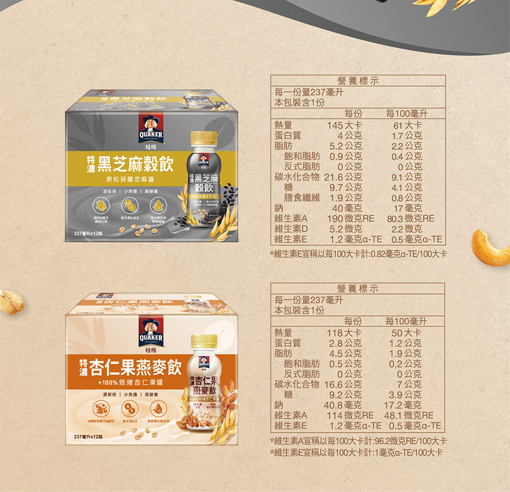 | 成分/內容物 | 水、燕麥粉、蔗糖、杏仁果醬(100%杏仁果)、綜合堅果粉(燕麥、非基因改造黃豆、黑豆、小麥胚芽、黑芝麻、核桃、腰果、榛果、松子)、香料、結蘭膠、維生素E-抗氧化劑、維生素A、維生素D3 過敏原訊息:本產品含有含麩質之穀物、堅果類、大豆、芝麻。本產品與其他含有牛奶、芒果、魚類的產品於同一工廠或產線生產,食品過敏者請留意。 |