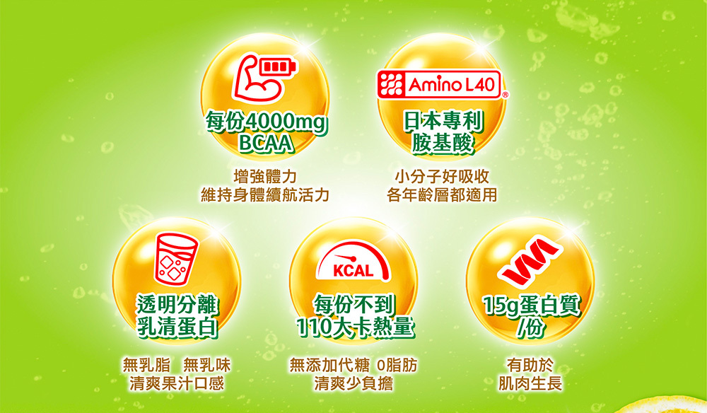 .每份含15克蛋白質及4000mg BCAA,幫助肌肉生長,增強體力及活力