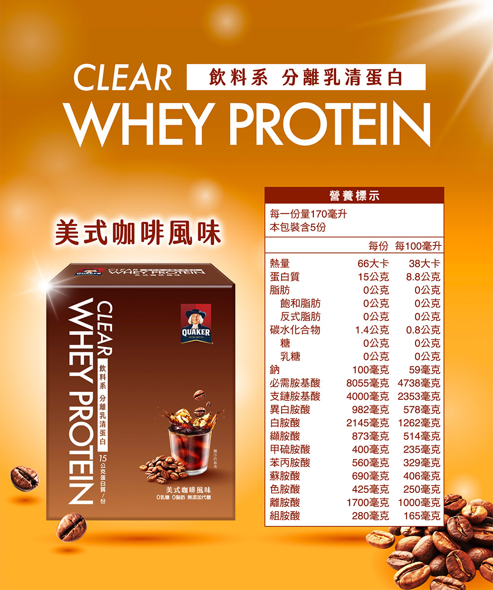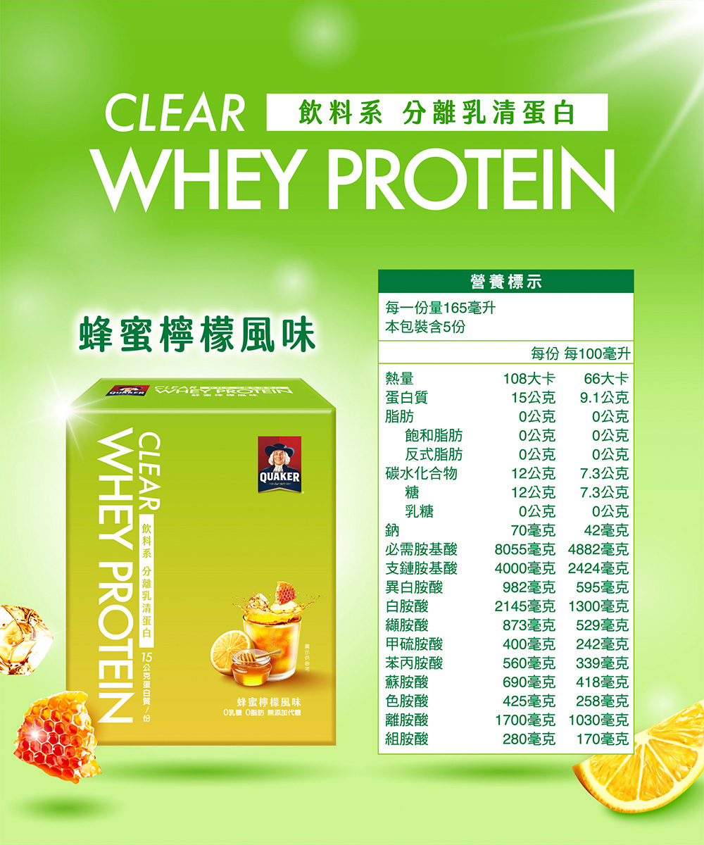 | 成分/內容物 | 蜂蜜檸檬:即溶分離乳清蛋白粉(分離乳清蛋白、葵花卵磷脂)、蔗糖、香料、檸檬酸、檸檬酸鈉、β-胡蘿蔔素、綜合胺基酸(L-白胺酸、鹽酸L-二胺基己酸、L-α胺基異戊酸、L-異白胺酸、L-羥丁胺酸、 L-苯丙胺酸、L-蛋胺酸、鹽酸L-組織胺酸、L-色胺酸)、支鏈胺基酸( L-白胺酸、L-異白胺酸、 L-α胺基異戊酸)。 芒果優格:即溶分離乳清蛋白粉(分離乳清蛋白、葵花卵磷脂)、蔗糖、香料、檸檬酸、檸檬酸鈉、β-胡蘿蔔素、綜合胺基酸(L-白胺酸、鹽酸L-二胺基己酸、L-α胺基異戊酸、L-異白胺酸、L-羥丁胺酸、 L-苯丙胺酸、L-蛋胺酸、鹽酸L-組織胺酸、L-色胺酸)、支鏈胺基酸( L-白胺酸、L-異白胺酸、 L-α胺基異戊酸)。 美式咖啡:即溶分離乳清蛋白粉(分離乳清蛋白、葵花卵磷脂)、咖啡粉、香料、綜合胺基酸(L-白胺酸、鹽酸L-二胺基己酸、L-α胺基異戊酸、L-異白胺酸、L-羥丁胺酸、 L-苯丙胺酸、L-蛋胺酸、鹽酸L-組織胺酸、L-色胺酸)、支鏈胺基酸( L-白胺酸、L-異白胺酸、 L-α胺基異戊酸)。 琥珀紅萱:即溶分離乳清蛋白粉(分離乳清蛋白、葵花卵磷脂)、蔗糖、紅茶粉、香料、綜合胺基酸(L-白胺酸、鹽酸L-二胺基己酸、L-α胺基異戊酸、L-異白胺酸、L-羥丁胺酸、 L-苯丙胺酸、L-蛋胺酸、鹽酸L-組織胺酸、L-色胺酸)、支鏈胺基酸( L-白胺酸、L-異白胺酸、 L-α胺基異戊酸)。 |