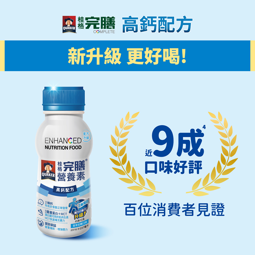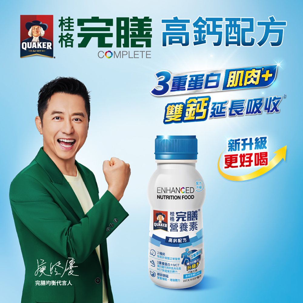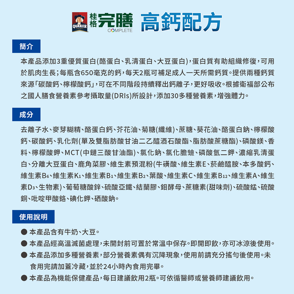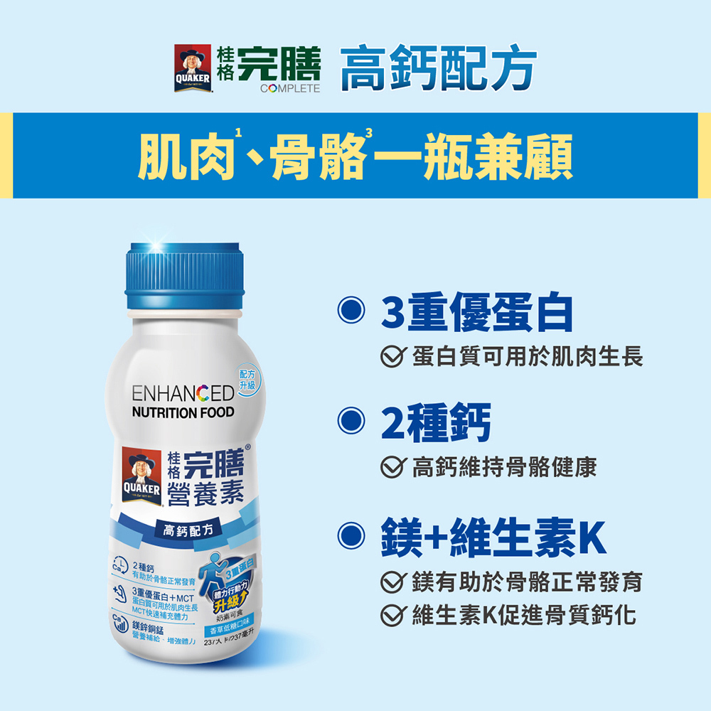 桂格完膳營養素高鈣配方隨身瓶,添加3重優質蛋白質(酪蛋白、乳清蛋白、大豆蛋白),讓你補體力跟肌力,也能同時補鈣