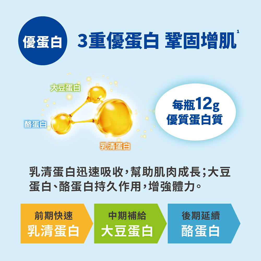.第一重:科學證實3種蛋白質作用更持久*,蛋白質有助肌肉生長。每瓶高達12g的優質蛋白質以及MCT中鏈脂肪酸,給你好肌力、好體力!