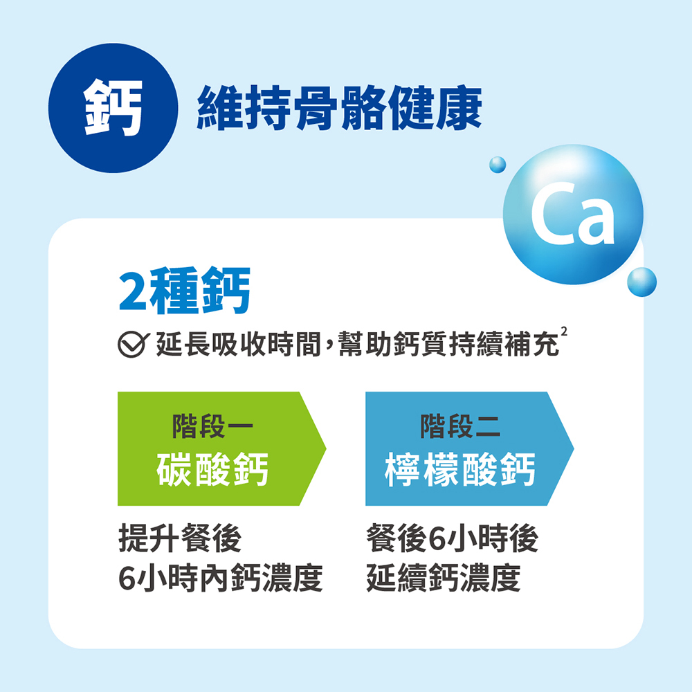 .第二重:每瓶提供650mg的鈣,2種鈣質來源,一天2瓶補足成人所需鈣質。雙鈣(碳酸鈣、檸檬酸鈣)配方延長吸收時間,6小時持續補鈣