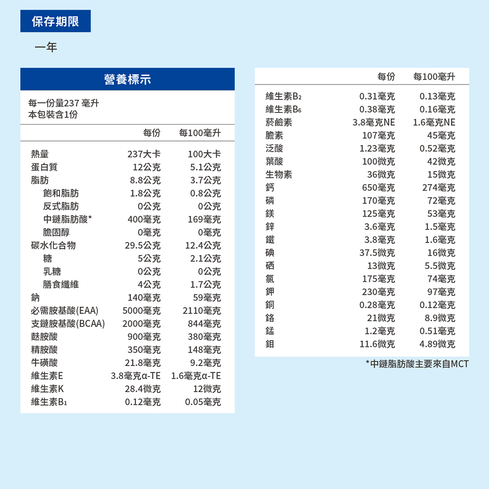 | 成分/內容物 | 去離子水、麥芽糊精、酪蛋白鈣、芥花油、菊糖(纖維)、蔗糖、葵花油、酪蛋白鈉、檸檬酸鈣、碳酸鈣、乳化劑(單及雙脂肪酸甘油二乙醯酒石酸酯、脂肪酸蔗糖酯)、磷酸鎂、香料、檸檬酸鉀、MCT(中鏈三酸甘油酯)、氯化鈉、氯化膽𭺷、磷酸氫二鉀、濃縮乳清蛋白、分離大豆蛋白、鹿角菜膠 、維生素預混粉(牛磺酸、維生素E、菸鹼醯胺、本多酸鈣、維生素B6、維生素K1、維生素B1、維生素B2、葉酸、維生素C、維生素B12、維生素A、維生素D3、生物素)、葡萄糖酸鋅 、硫酸亞鐵、結蘭膠、鉬酵母、蔗糖素(甜味劑)、硫酸錳 、硫酸銅、吡啶甲酸鉻、碘化鉀、硒酸鈉 (本產品含有牛奶) |