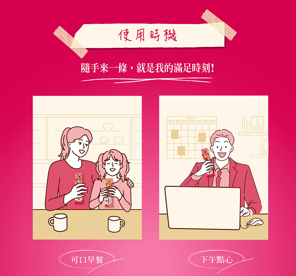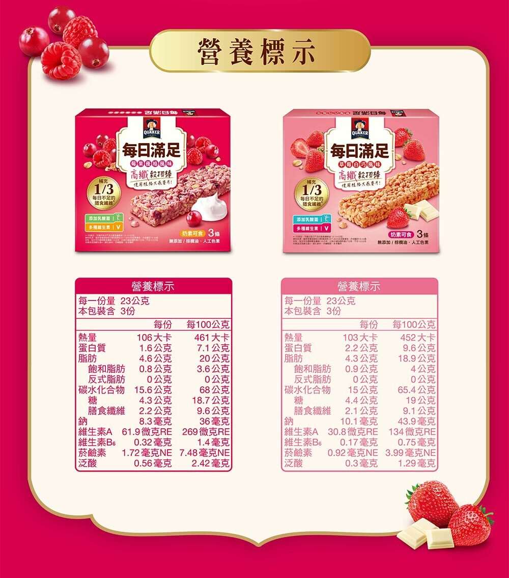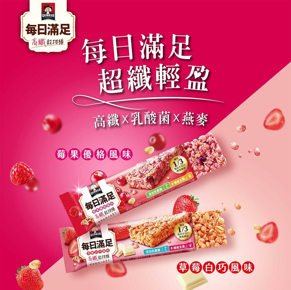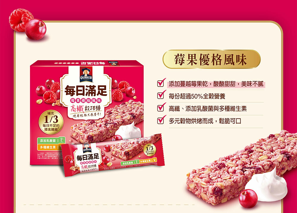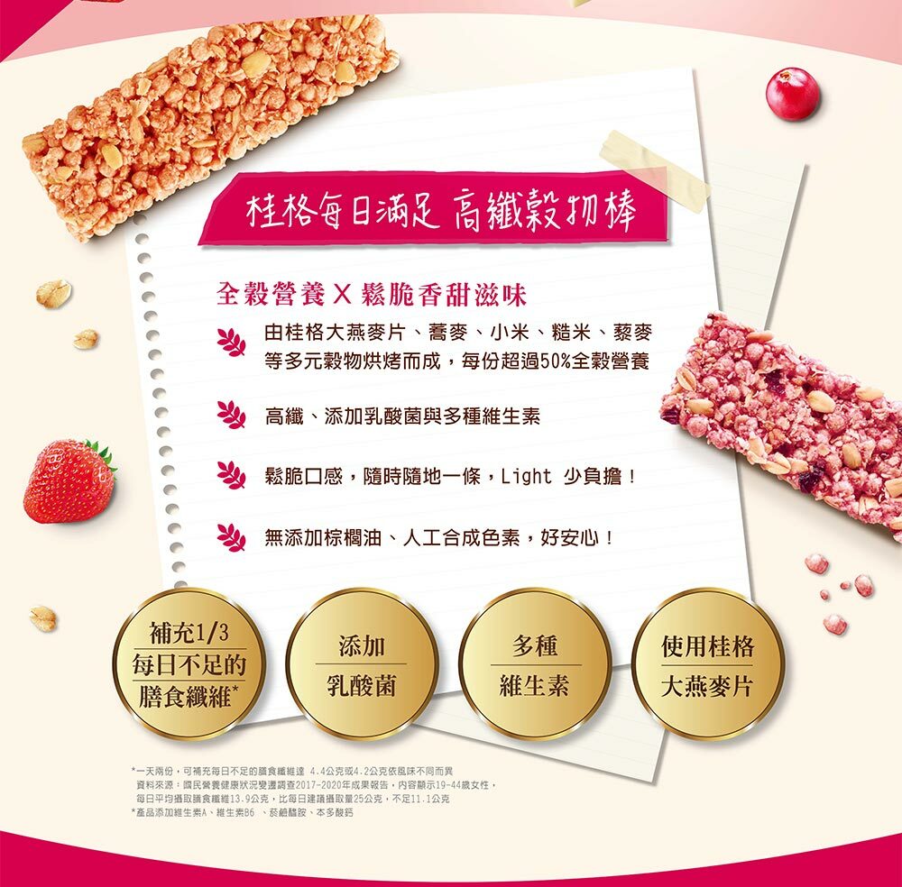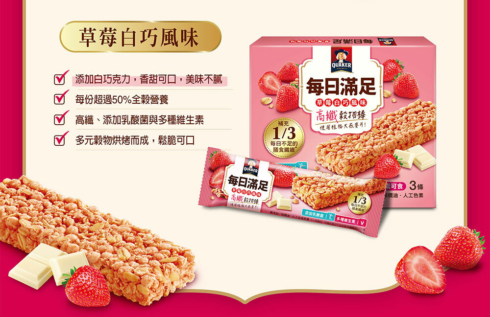 特濃草莓,以獨特烤焙技術,推出的香甜美味、酥脆可口的「桂格每日滿足高纖穀物棒」。由燕麥、蕎麥、小米、糙米、藜麥等多元穀物烘烤而成,每份超過50%全穀營養,補充每日不足的膳食纖維,還添加乳酸菌與多種維生素,每份不到110大卡,Light少負擔,隨時隨地,每日滿足!