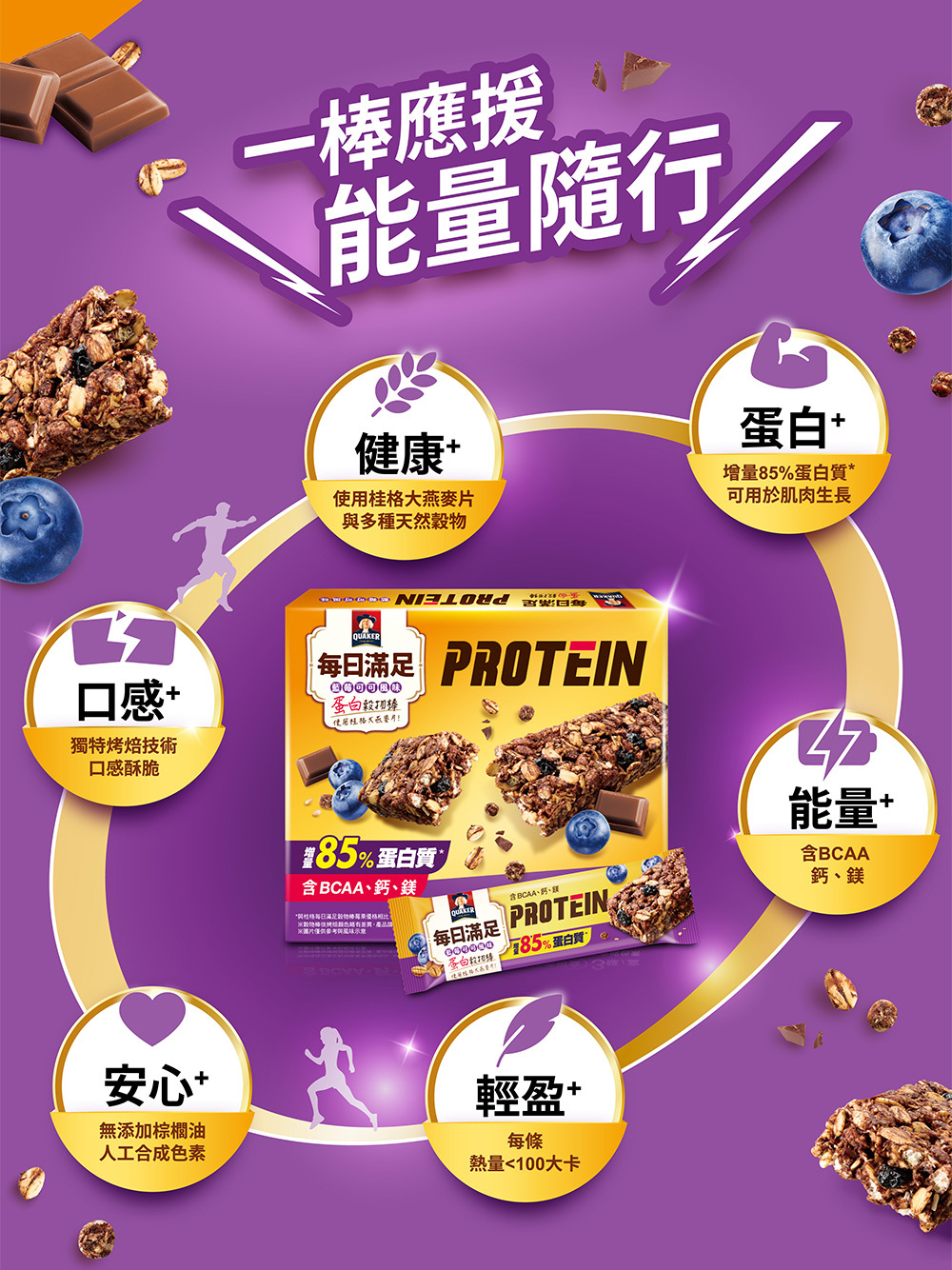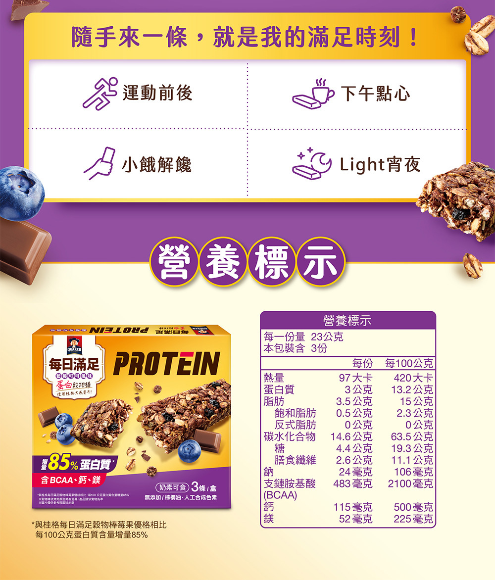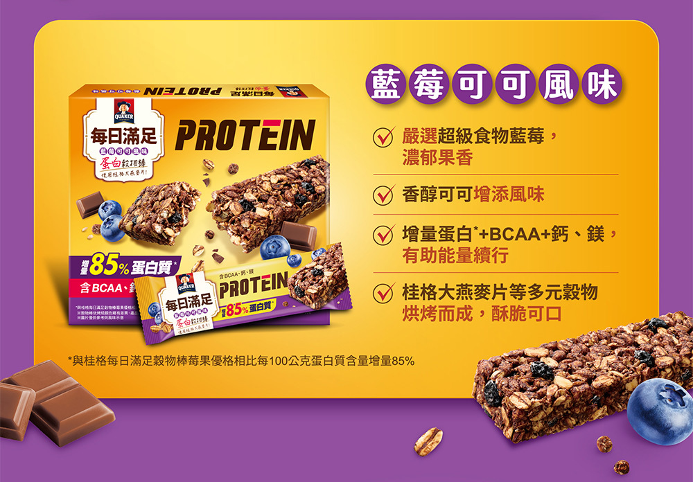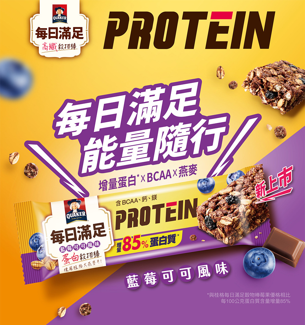 *與桂格每日滿足穀物棒莓果優格相比,每100 公克蛋白質含量增量85%