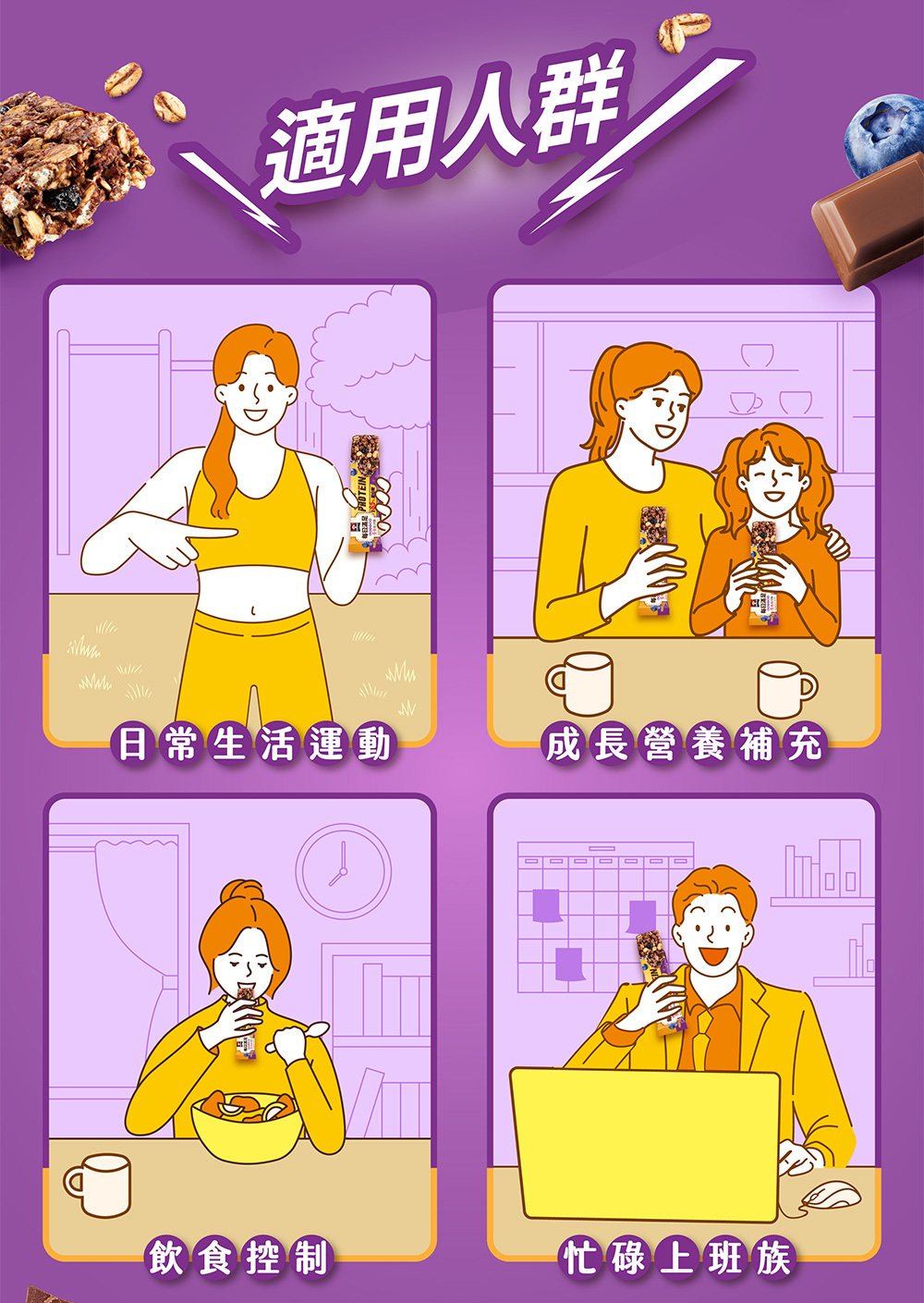 .嚴選藍莓,以獨特烤焙技術,果香濃郁、酥脆可口。由燕麥、小米、糙米等多元穀物烘烤而成,每份超過51%全穀營養。