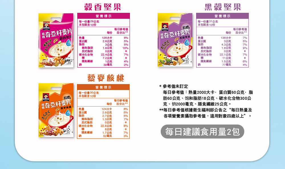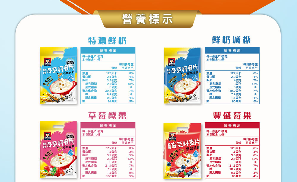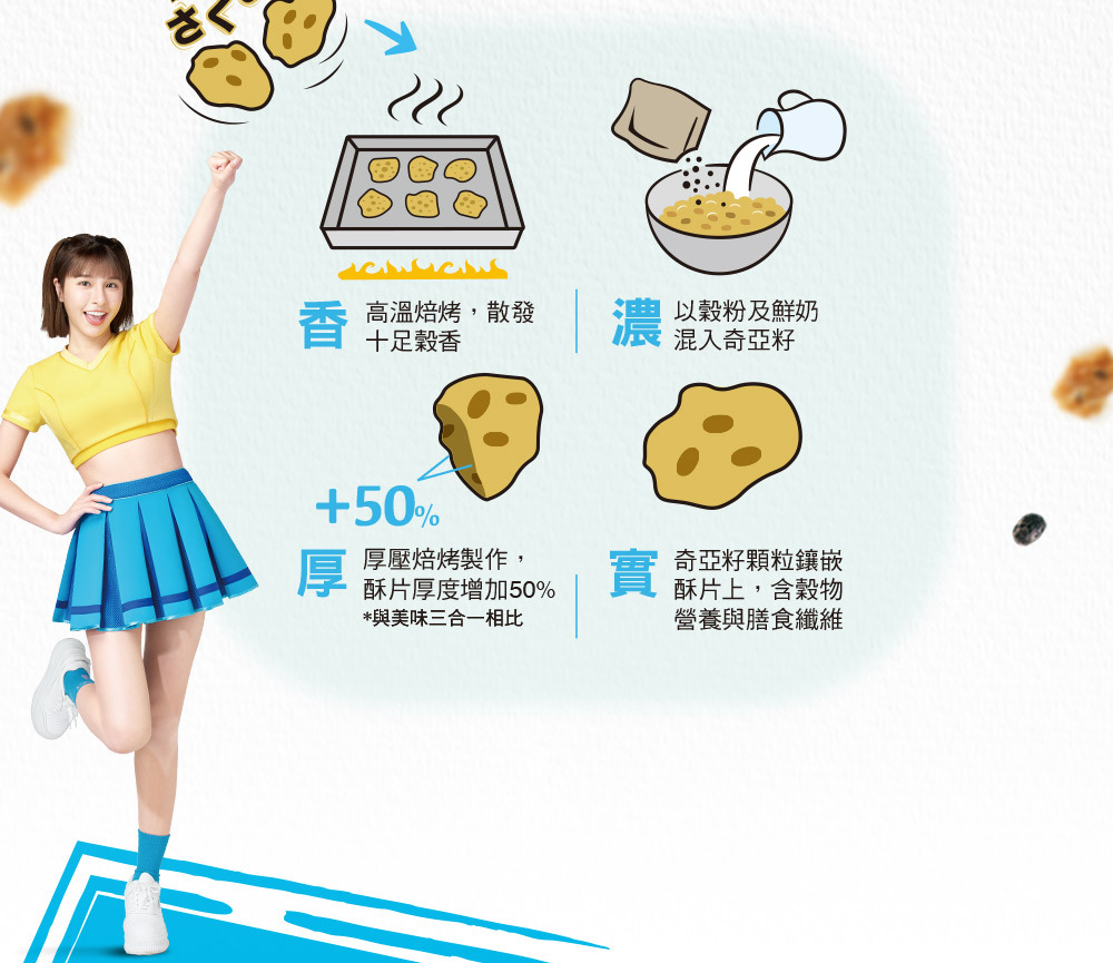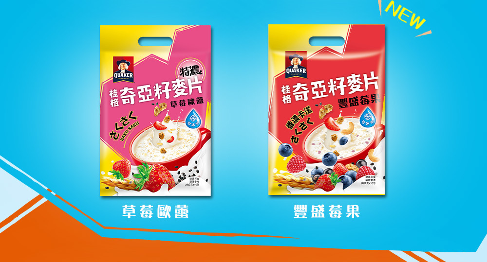 桂格利用獨家穀物烘烤技術,將充滿能量的奇亞籽顆粒 (Chia Seeds) 結合多元榖物,厚壓出驚奇口感、營養美味的「奇亞籽能量酥片」,隨時一杯,給你卡滋爽脆的全新味蕾享受!