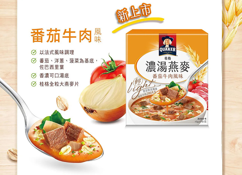 | 成分/內容物 | 大燕麥片、燕麥粉、麥芽糊精、蔗糖、番茄粉、香料、酵母抽出物、非氫化棕櫚仁油、食鹽、乳脂粉(乳脂、脫脂乳粉)、牛肉(牛肉、玉米澱粉、食鹽、味精)、小麥纖維、洋蔥、菠菜、乳清粉、關華豆膠、紅甜菜粉、β-胡蘿蔔素、洋香菜葉(巴西里葉)、調味劑(5'-次黃嘌呤核苷磷酸二鈉、5'-鳥嘌呤核苷磷酸二鈉)、黑胡椒、綜合香草[奧勒岡葉、羅勒葉、迷迭香葉、蒜粒、紅辣椒、馬郁蘭葉、洋香菜葉(巴西里葉)]、維生素E-抗氧化劑。 |