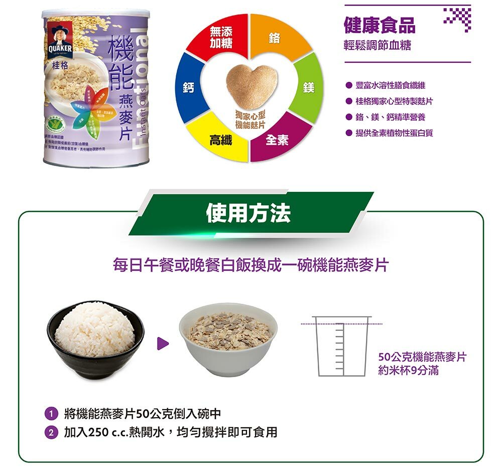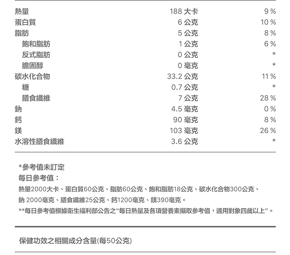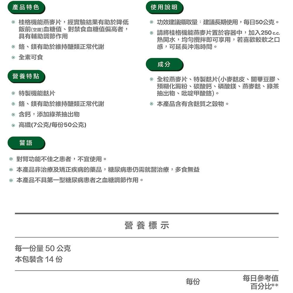 | 成分/內容物 | 全粒燕麥片、特製麩片(小麥麩皮、關華豆膠、預糊化澱粉、碳酸鈣、磷酸鎂、燕麥麩、綠茶抽出物、吡啶甲酸鉻) |