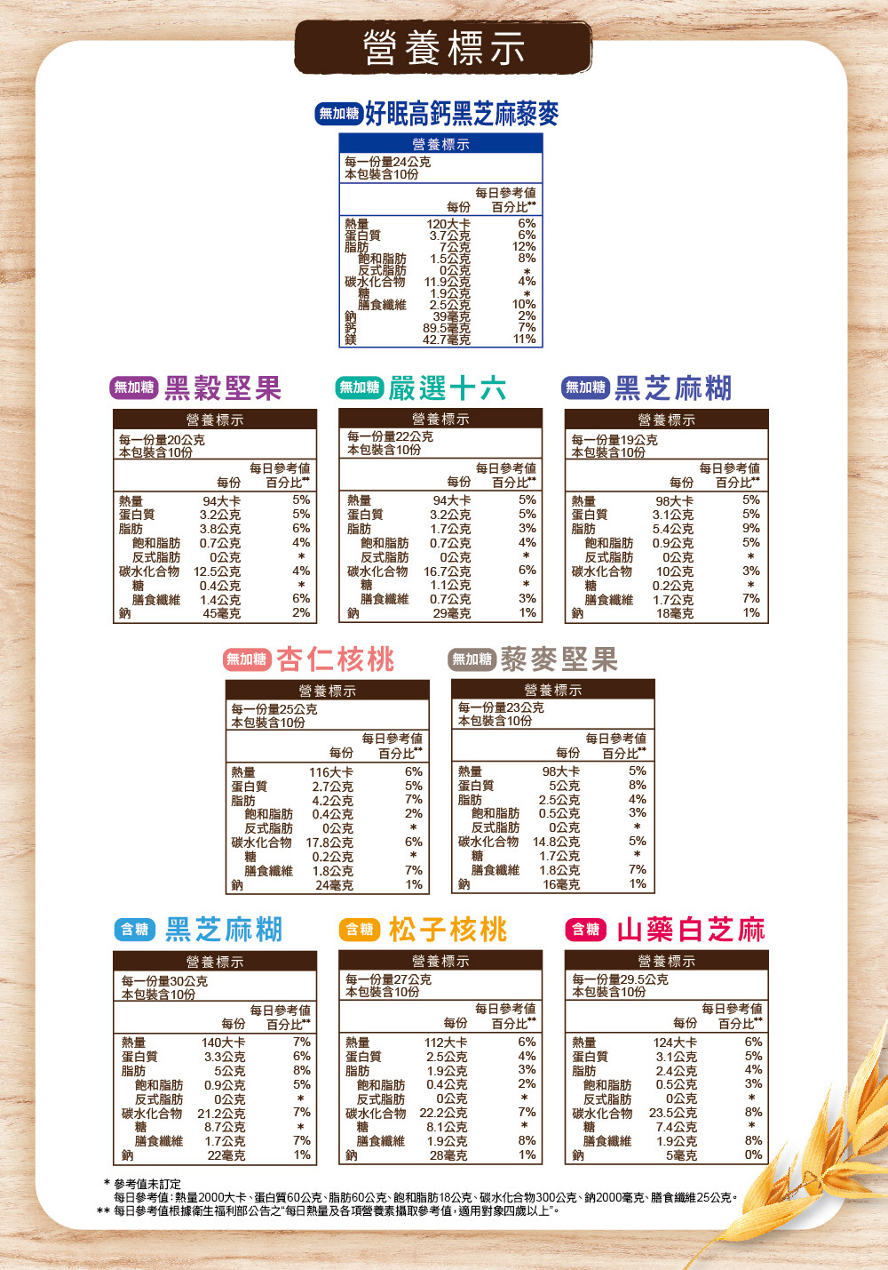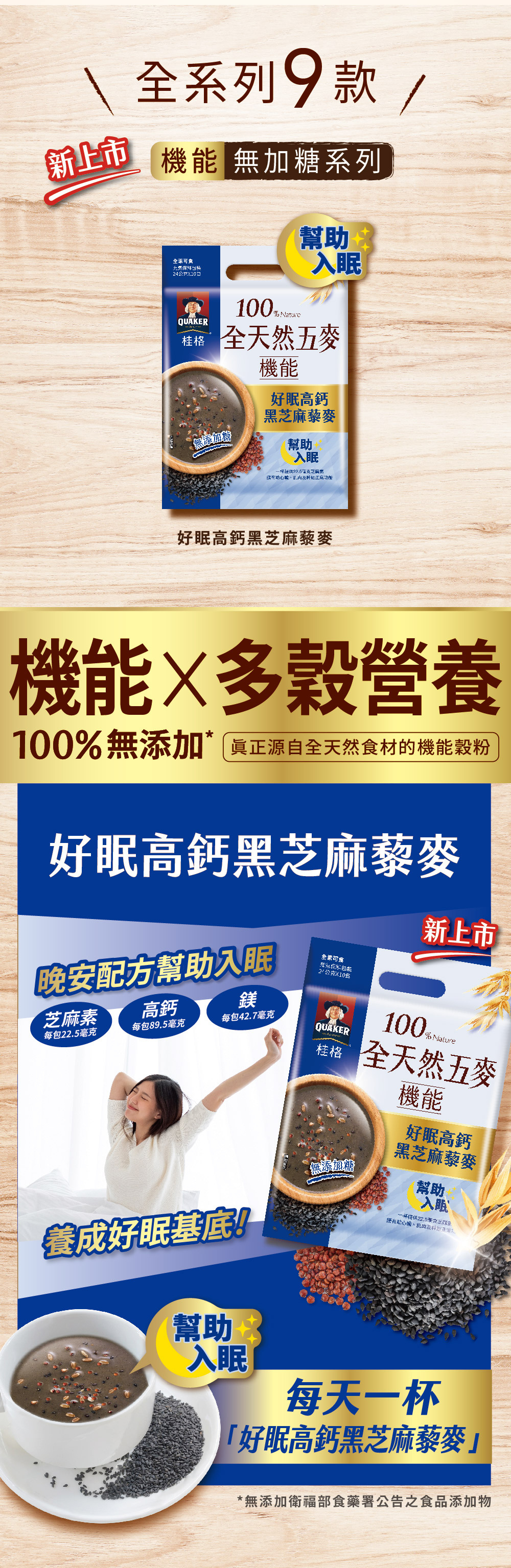 .以全天然五麥為基礎,設計出「好眠黑芝麻藜麥」配方,每日一杯即可提供22.5毫克的芝麻素!