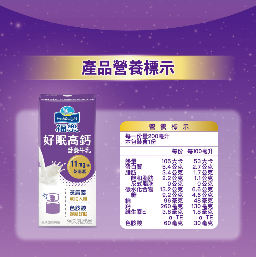 | 成分/內容物 | 水、乳粉、異麥芽寡醣、麥芽糊精、生乳、乳化安定劑(脂肪酸甘油酯、海藻酸鈉、鹿角菜膠、關華豆膠)、碳酸鈣、香料、結蘭膠、芝麻抽出物(含芝麻素)、葡萄糖酸鋅、維生素D3。 |