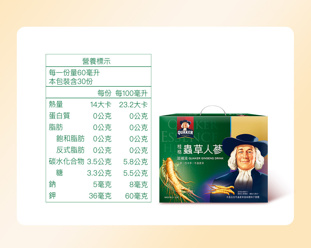 | 成分/內容物 | 冬蟲夏草人蔘萃取液(水、西洋蔘、人蔘、蓮子、百合、冬蟲夏草)、冬蟲夏草菌絲體(中華被毛孢Hirsutella sinensis)萃取液、冰糖 |