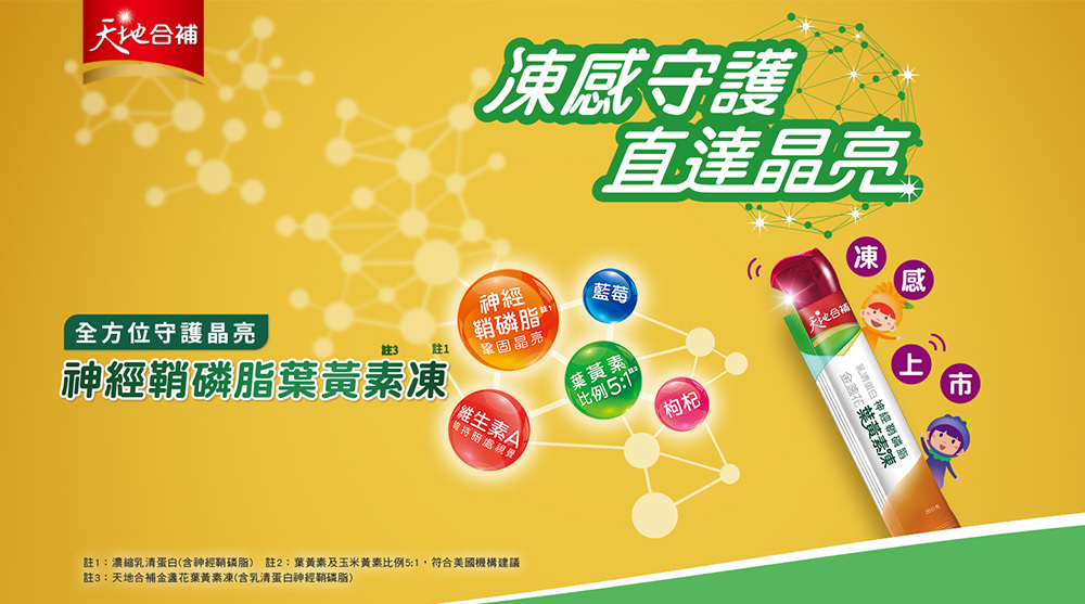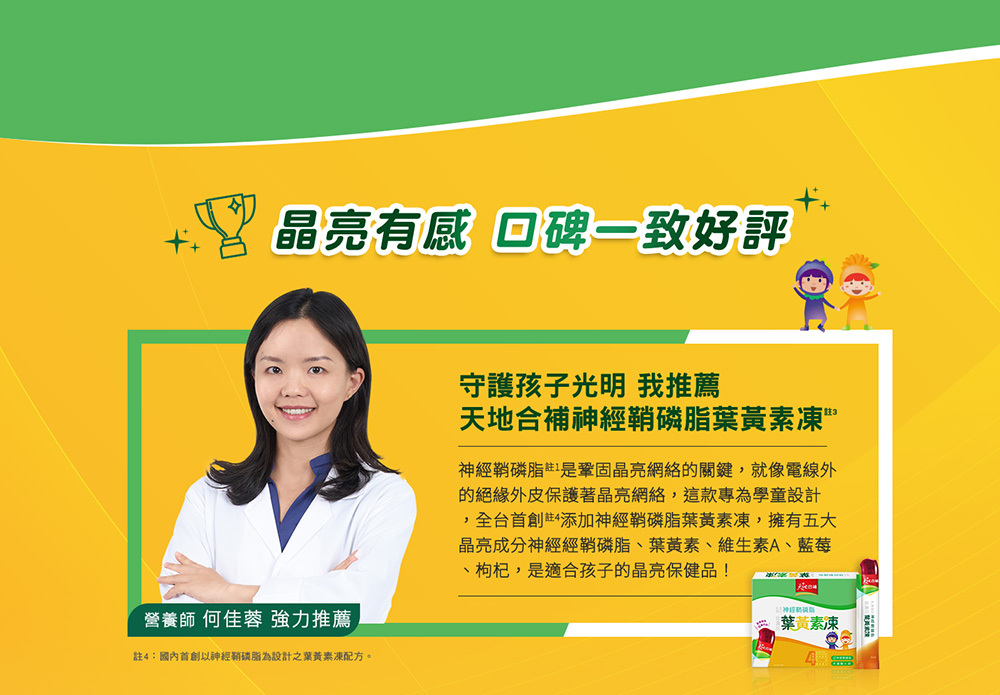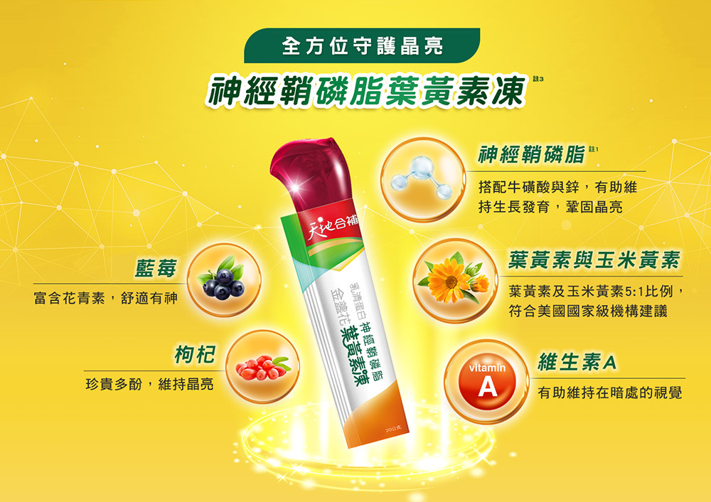 天地合補金盞花葉黃素凍(含乳清蛋白神經鞘磷脂),專為學童設計配方,全方位守護晶亮發育關鍵期,幫助晶采有神