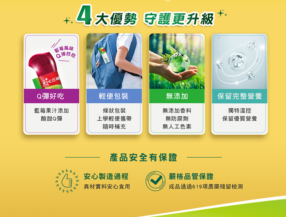 | 成分/內容物 | 100%藍莓汁(水、藍莓濃縮汁)、冰糖、枸杞黑豆萃取液(水、枸杞、青仁黑豆)、葡萄濃縮汁、濃縮乳清蛋白(含神經鞘磷脂)、金盞花萃取物(含葉黃素)(麥芽寡醣、阿拉伯膠、金盞花萃取物)、刺槐豆膠、玉米糖膠、檸檬酸鈉、檸檬酸、洋菜粉、金盞花萃取物(含玉米黃素)(麥芽寡醣、阿拉伯膠、金盞花萃取物)、葡萄糖酸鋅、維生素A、牛磺酸、維生素C、維生素E、磷酸鎂。 本產品含有大豆、牛奶 |