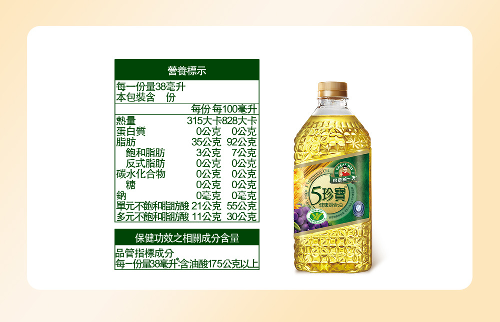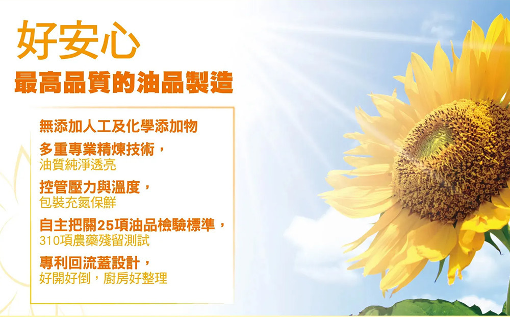 .五種優質油種完美組合,葵花油、芥花油、頂級橄欖油、葡萄籽油、玉米油