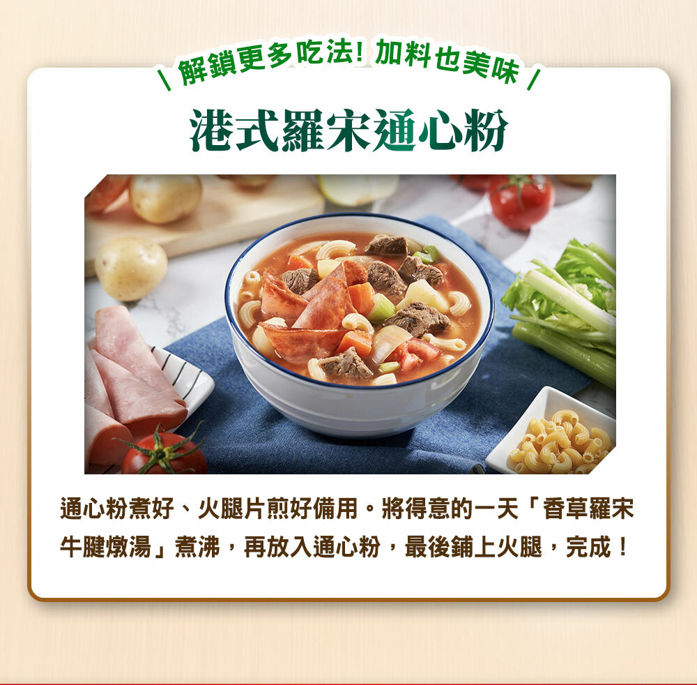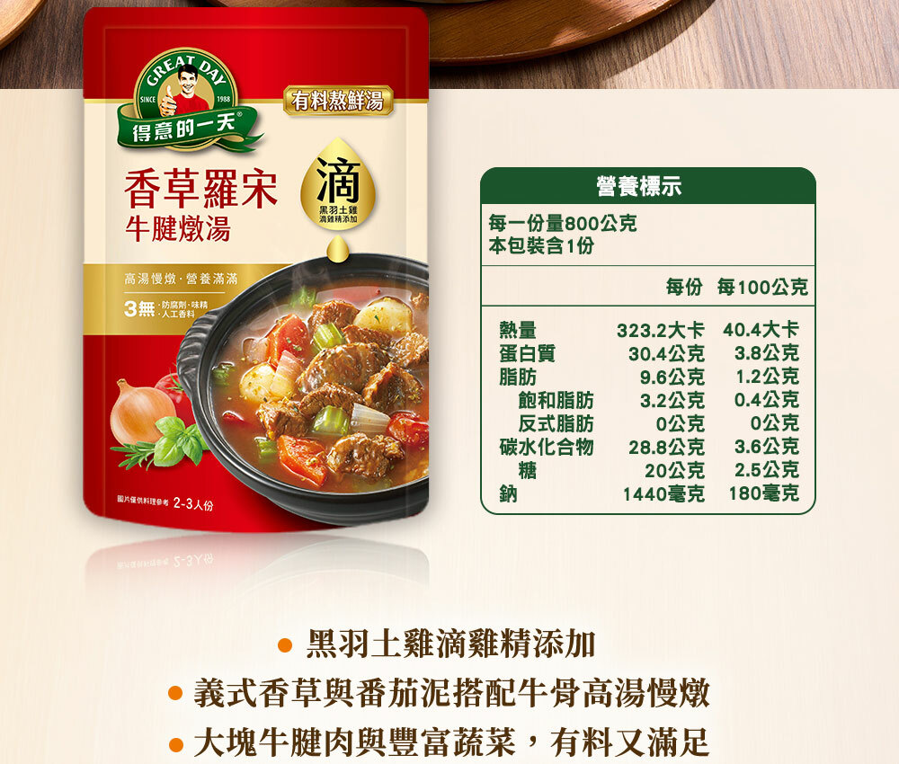 | 成分/內容物 | 牛高湯[水、濃縮牛骨高湯(牛骨、水、維生素 E-抗氧化劑)、滴雞精]、牛腱肉、洋蔥、西芹、胡蘿蔔、馬鈴薯、番茄泥、番茄、蔗糖、高油酸葵花油、食鹽、濃縮檸檬汁、綜合義式香草[月桂葉、奧勒岡葉、羅勒葉、迷迭香葉、蒜粒、紅辣椒、馬郁蘭葉、洋香菜葉(巴西里葉)]、酵母抽出物、老薑粉、香蒜粉、白胡椒粉、維生素 E-抗氧化劑、黑胡椒粒 |