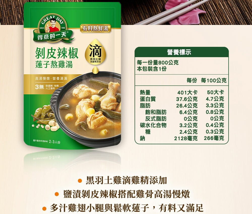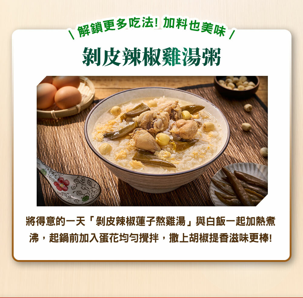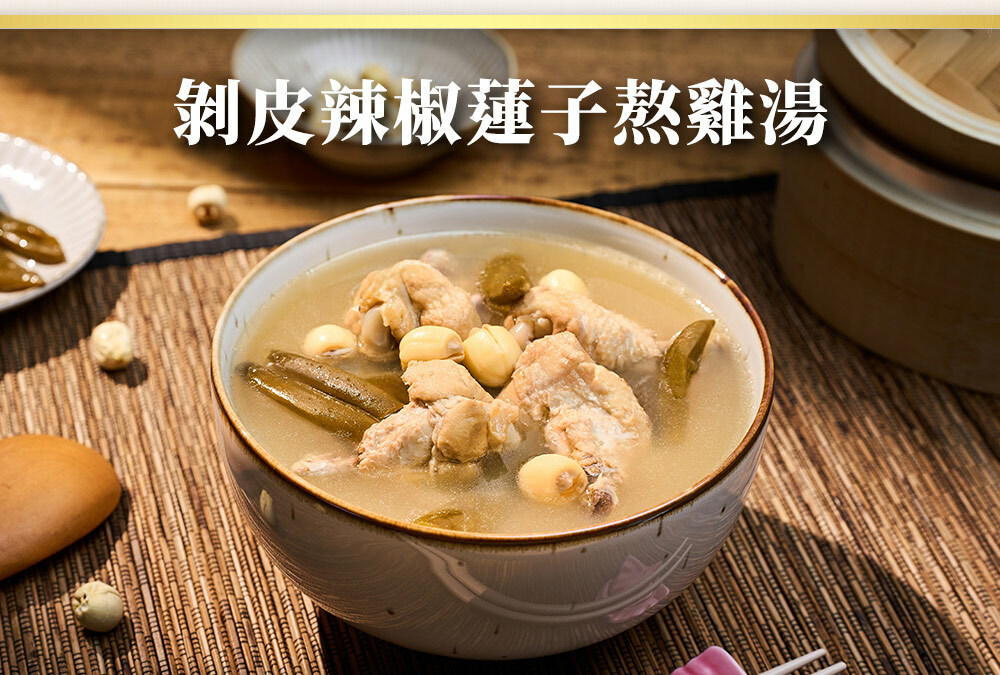 | 成分/內容物 | 雞高湯 (水、雞骨)、雞翅小腿、剝皮辣椒 (辣椒、食鹽)、食鹽、蓮子、蔗糖、酵母抽出物、白胡椒粉、老薑粉、維生素 E-抗氧化劑 |