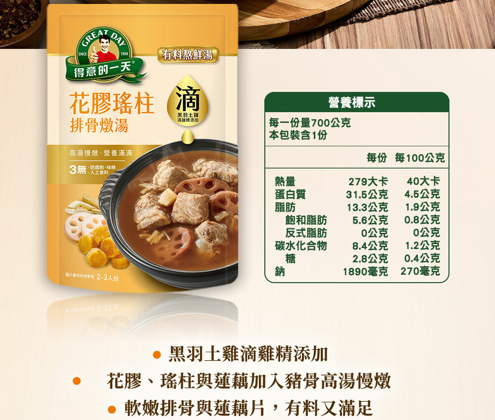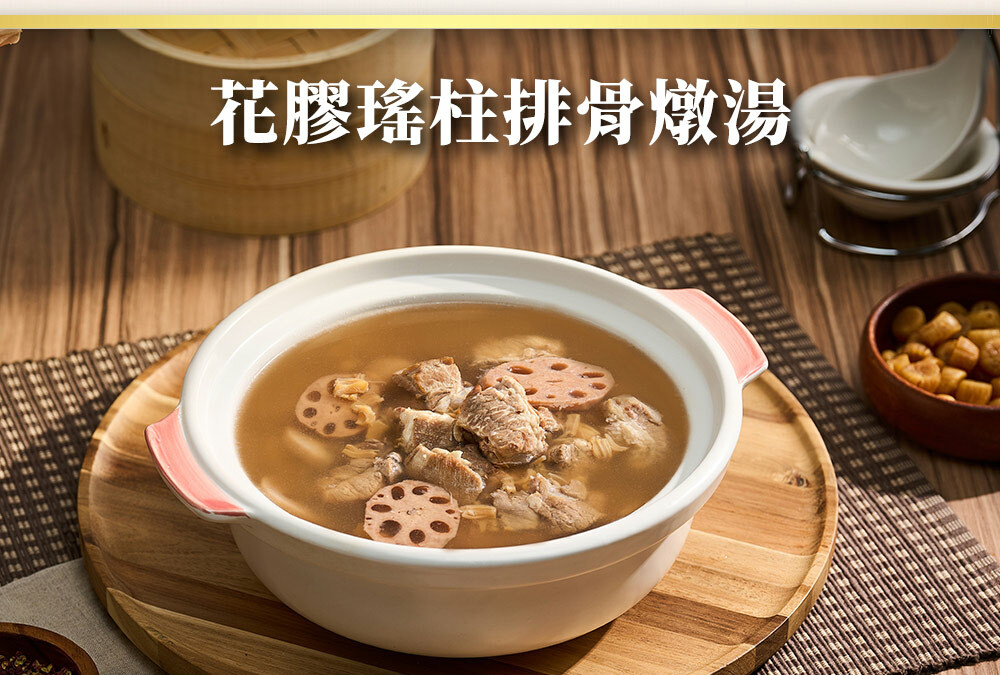 | 成分/內容物 | 高湯[豬高湯(水、豬皮、豬骨、高麗菜、洋蔥、青蔥、薑、龍眼肉、黃耆)、滴雞精]、豬排骨、蓮藕、干貝(瑤柱)、食鹽、花膠(魚肚、水)、蔗糖、玉米糖膠、酵母抽出物、維生素 E-抗氧化劑 |