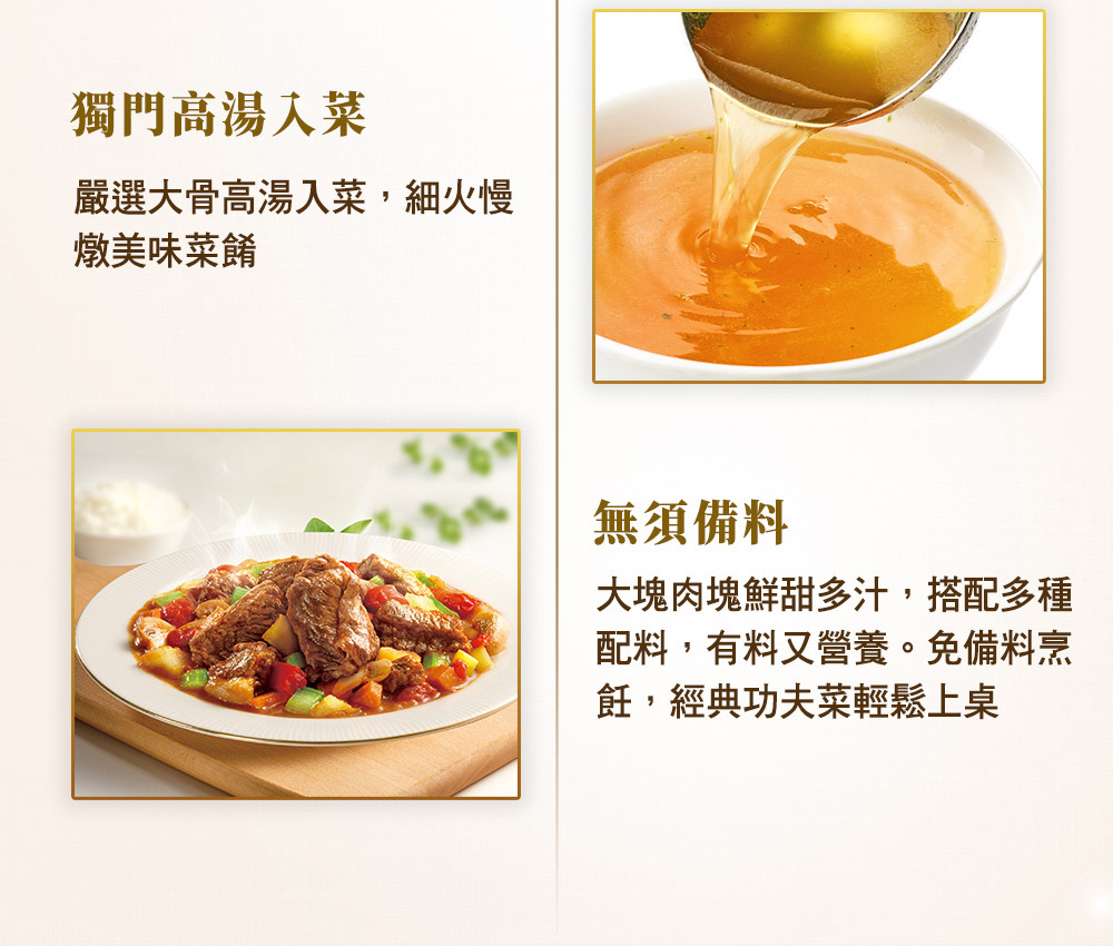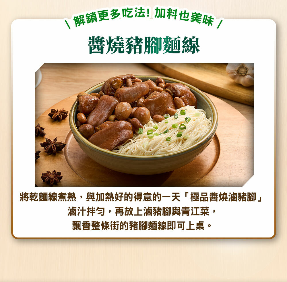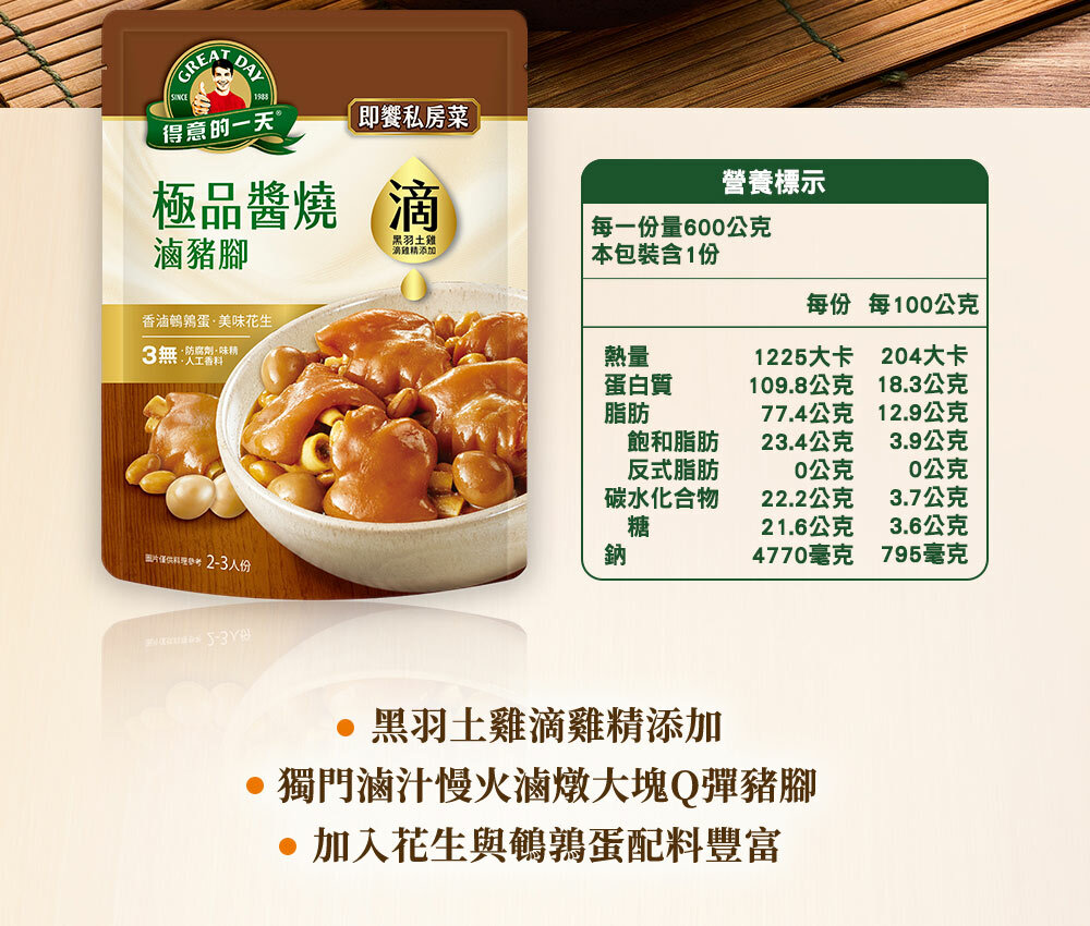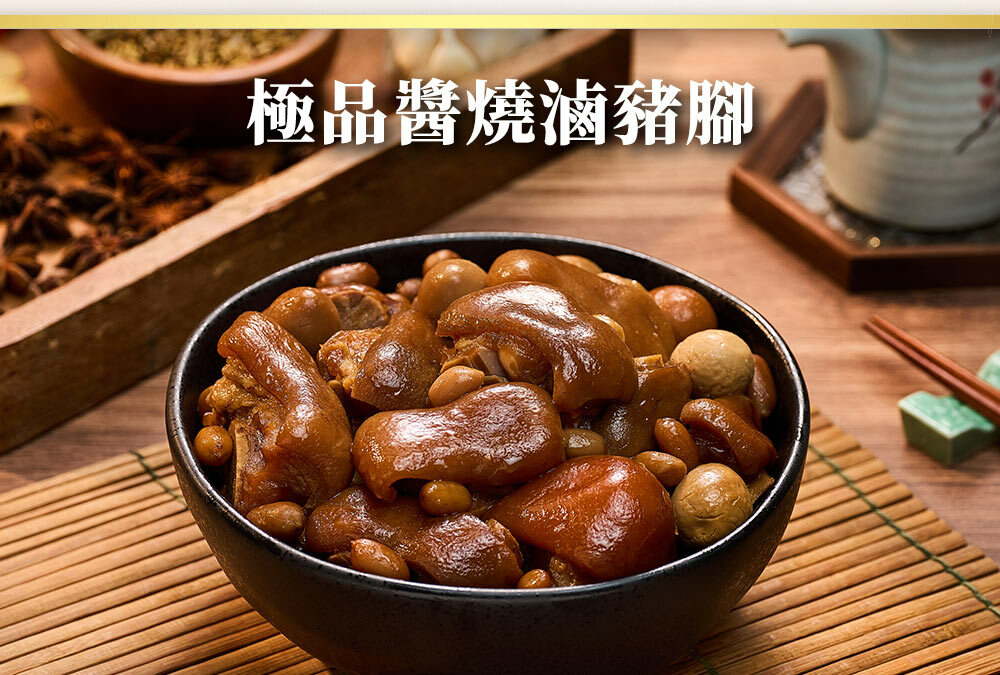 | 成分/內容物 | 豬腳、高湯滷汁{水、醬油、高湯[濃縮豬骨高湯(豬骨、水)、滴雞精]、蔗糖、昆布抽出液[昆布抽出物(昆布、水)、糊精、食鹽、小麥水解蛋白、酵母抽出物]、食鹽、蒜、白胡椒、辣椒、五香粉(小茴香、肉桂、八角、胡荽、丁香) }、花生、鵪鶉蛋、芥花油、冰糖、紅蔥酥[紅蔥頭、芥花油、維生素E(抗氧化劑)]、玉米糖膠、維生素E(抗氧化劑) |