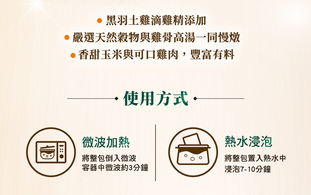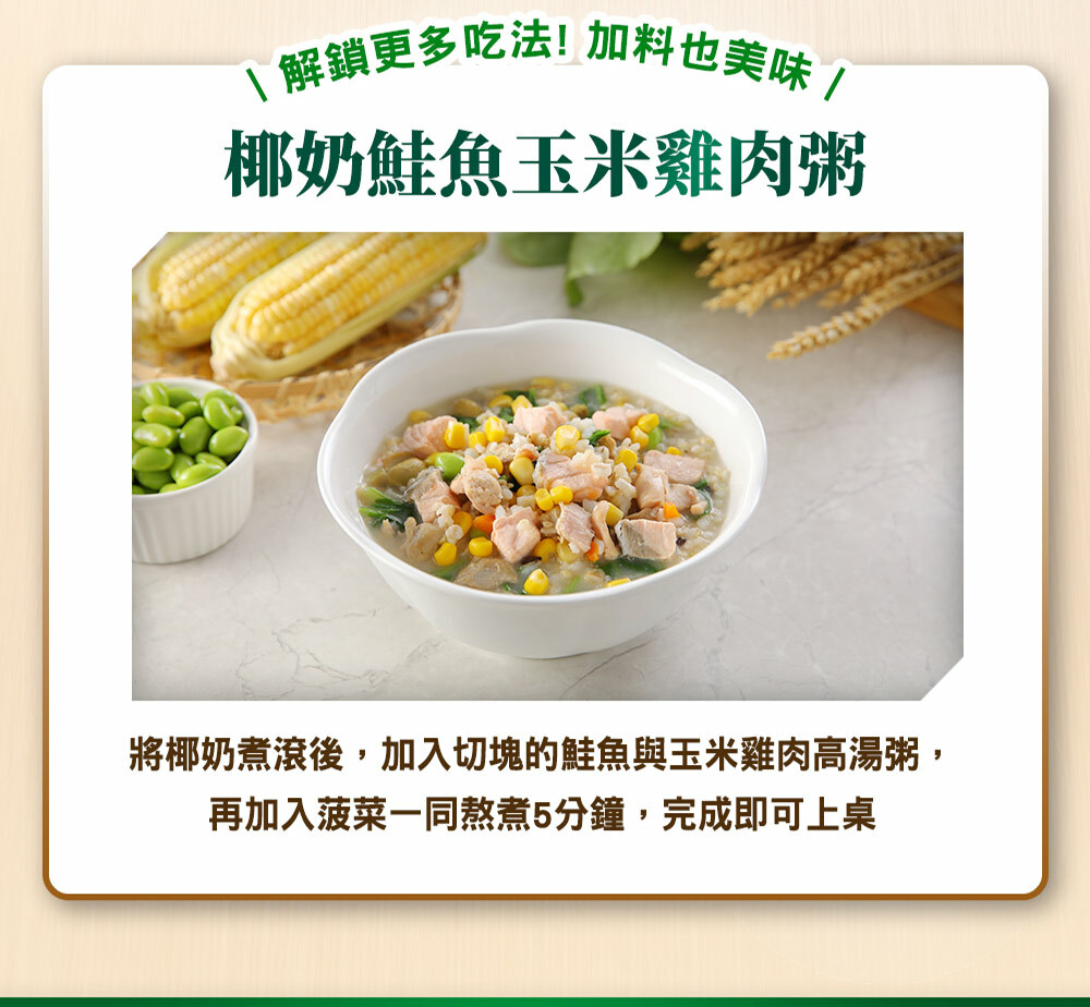 .4 種天然穀物與雞骨高湯一同慢燉,口感 Q 彈不軟爛。