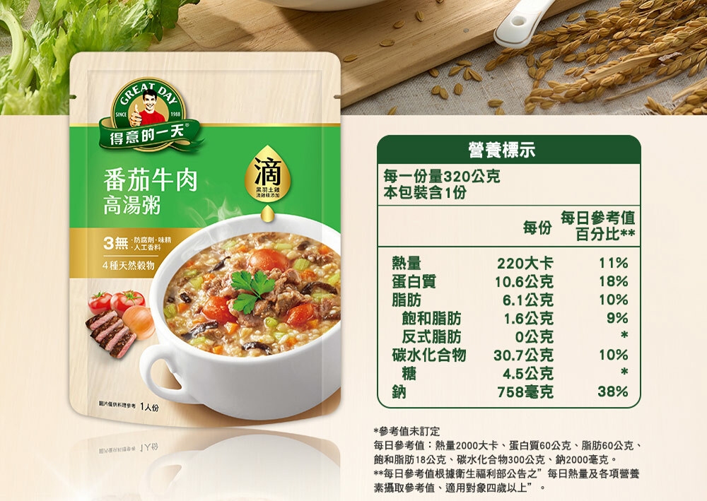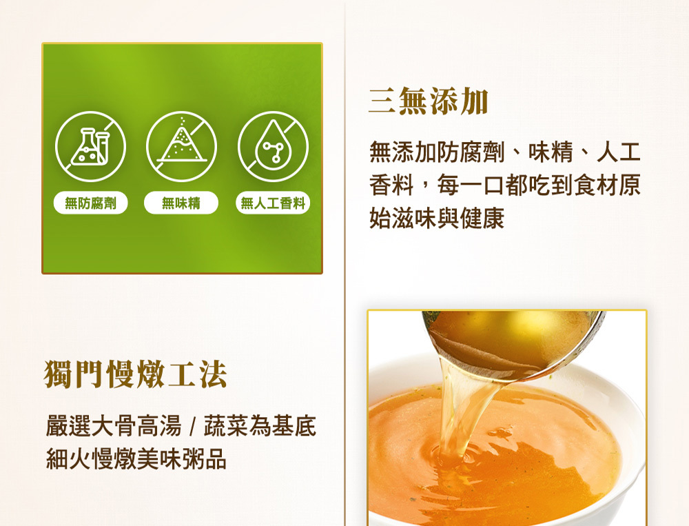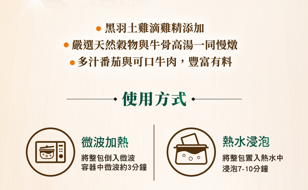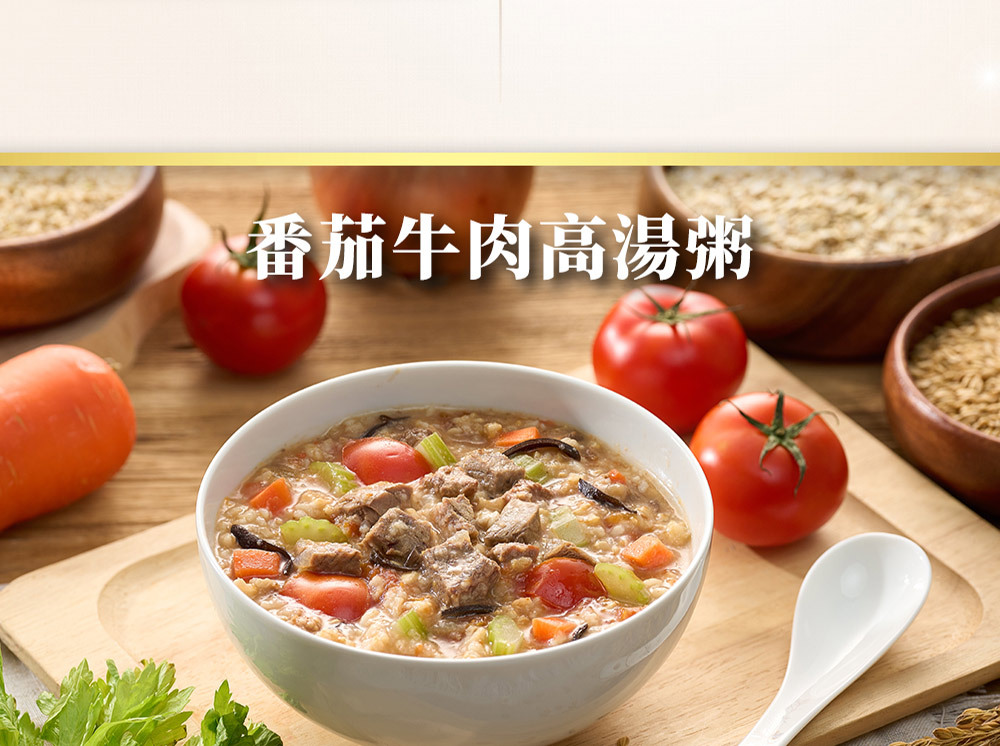 | 成分/內容物 | 高湯 [水、濃縮牛骨高湯(牛骨、水、維生素E-抗氧化劑)、滴雞精]、綜合蔬菜 (番茄、西芹、洋蔥、紅蘿蔔、番茄泥、黑木耳絲)、綜合穀物(糙米、燕麥、大麥、小米)、牛肉、橄欖油、食鹽、蔗糖、酵母抽出物、維生素E-抗氧化劑、黑胡椒粉、白胡椒粉。 |