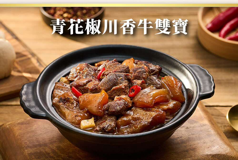 .嚴選青花椒、辣椒等辛香料入醬醃製大塊牛腱肉與牛筋,半筋半肉的美味享受。