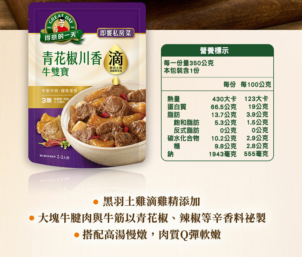 | 成分/內容物 | 牛腱肉、牛筋、高湯{水、昆布抽出液[昆布抽出物(昆布、水)、糊精、食鹽、小麥水解蛋白、酵母抽出物]、濃縮豬骨高湯(豬骨、水)、滴雞精}、杏鮑菇、蔗糖、蒜、辣豆瓣醬[黃豆(非基因改造)、水、辣椒、食鹽、蔗糖、麵粉、麻油、乳酸]、米酒、甜麵醬[黃豆(非基因改造)、米、水、蔗糖、食鹽、麵粉、麻油、乳酸]、醬油、辣椒、食鹽、薑、玉米澱粉、麻辣油[辣椒油(芥花油、蒜、辣椒、花椒、維生素E-抗氧化劑)、花椒粒、白胡椒粒、辣椒、藤椒粒]、青花椒粉、高油酸葵花油、八角、花椒粒、草果、月桂葉、玉米糖膠、丁香、維生素E-抗氧化劑 |