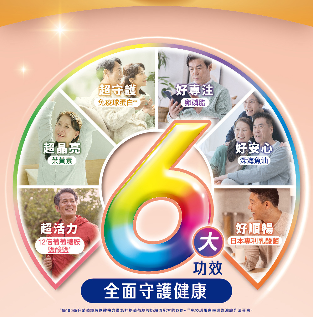 ·6大黃金複方,營養全方位-12倍葡萄糖胺、魚油、葉黃素、卵磷質、益生菌L137、免疫球蛋白