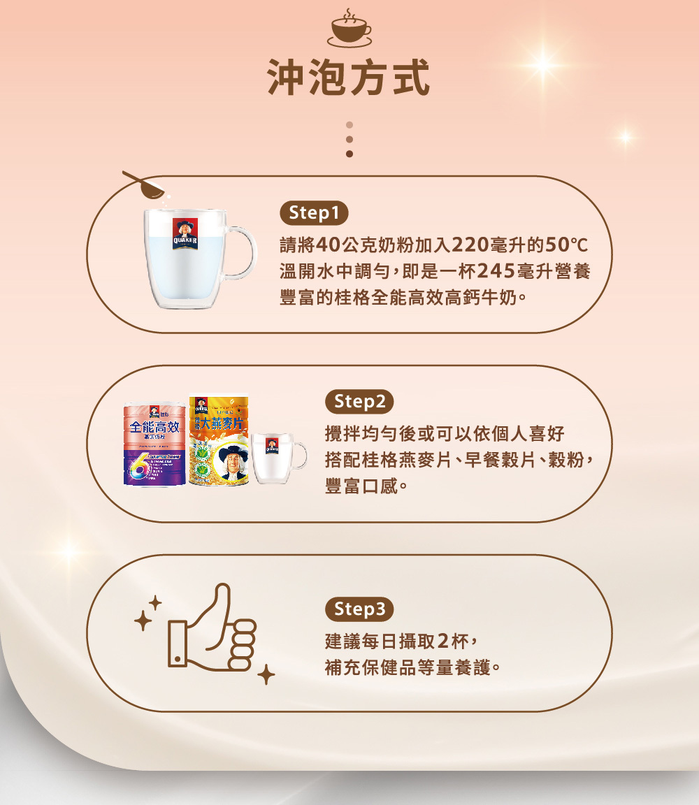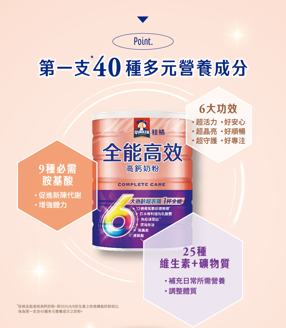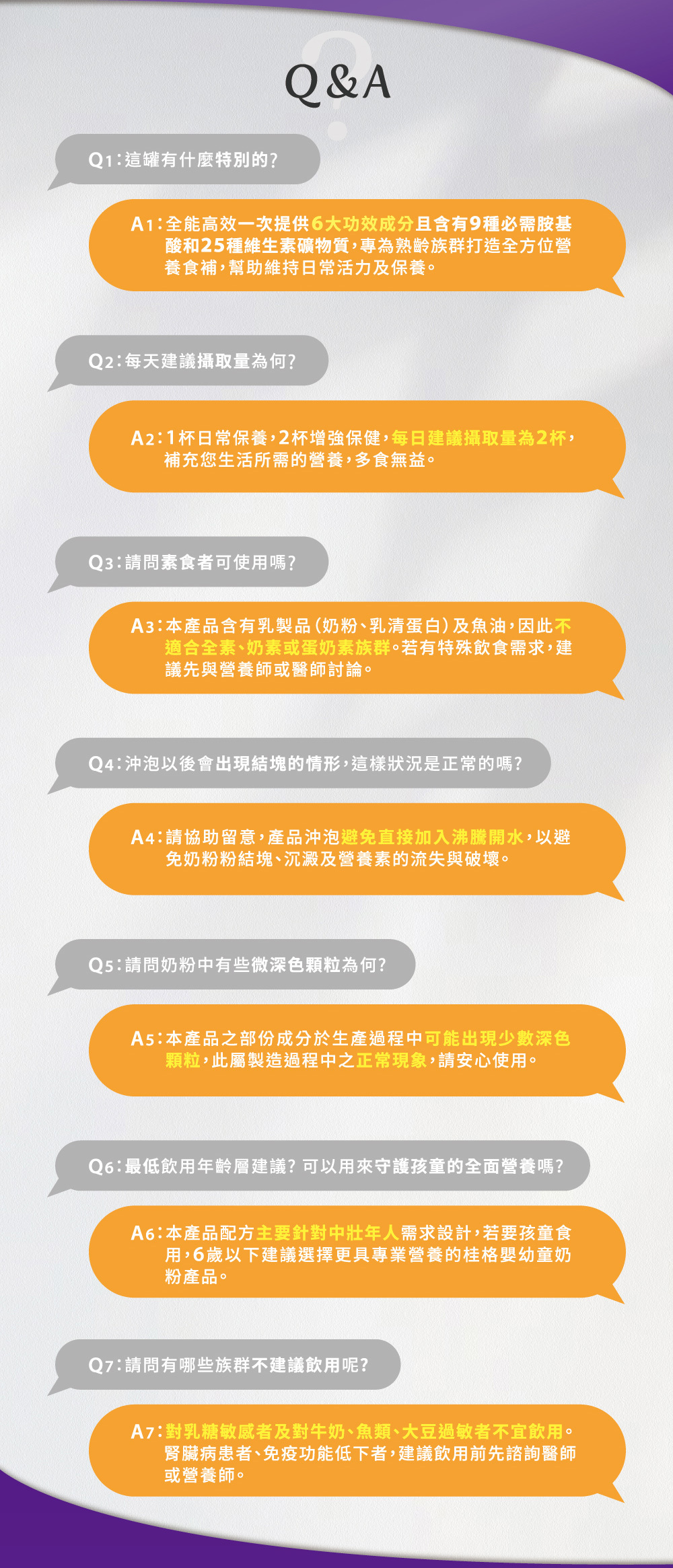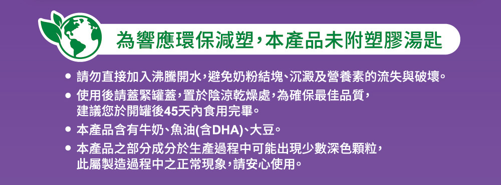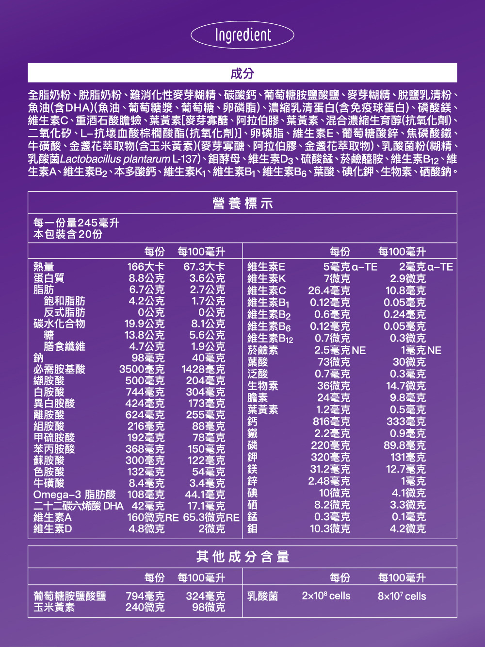 | 成分/內容物 | 全脂奶粉、脫脂奶粉、難消化性麥芽糊精、碳酸鈣、葡萄糖酸鈣、麥芽糊精、脫鹽乳清粉、魚油(含DHA)(魚油、葡萄糖漿、葡萄糖、卵磷脂)、濃縮乳清蛋白(含免疫球蛋白)、磷酸鎂、維生素C、重酒石酸膽鹼、葉黃素[麥芽糊精、阿拉伯膠、葉黃素、混合濃縮生育醇(抗氧化劑)、二氧化矽、L-抗壞血酸棕櫚酸酯(抗氧化劑)]、卵磷脂、維生素E、葡萄糖酸鋅、焦磷酸鐵、牛磺酸、金盞花萃取物(含玉米黃素)(麥芽糊精、阿拉伯膠、金盞花萃取物)、乳酸菌粉(糊精、乳酸菌Lactobacillusplantarum L-137)、鋅酵母、維生素D₃、硒酸鈉、茄紅素胺、維生素B₁₂、維生素A、維生素B₂、本多酸鈣、維生素K₁、維生素B₁、維生素B₆、葉酸、碘化鉀、生物素、磷酸鈉。 |
