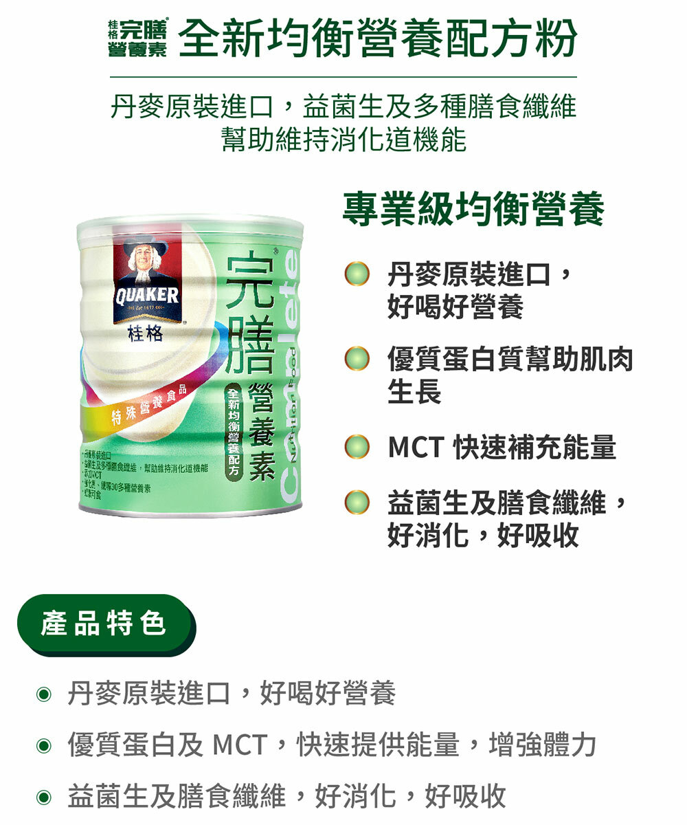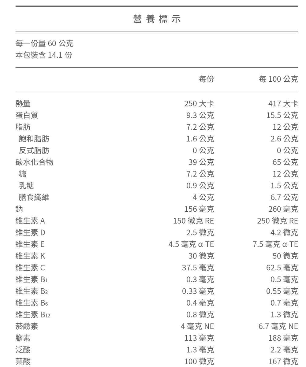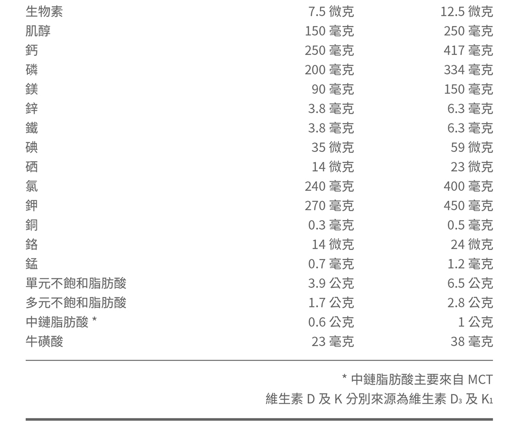 | 成分/內容物 | 麥芽糊精、濃縮乳清蛋白、蔗糖、植物油(非基因改造芥花油、葵花油、MCT(中鏈三酸甘油酯)、纖維(難消化性麥芽糊精、菊糖、FOS果寡醣)、水、卵磷脂、磷酸氫二鉀、氯化鈉、碳酸鈣、磷酸鎂、香草香料、乳酸鈣、磷酸氫鈣、氯化膽生僉、肌醇、檸檬酸鉀、維生素C、檸檬酸鈣、牛磺酸、焦磷酸鐵、硫酸鋅、維生素E、菸鹼醯胺、辛烯基丁二酸鈉澱粉、硫酸錳、本多酸鈣、阿拉伯膠、硫酸銅、綠茶萃取物(含多酚)、維生素B6、玉米澱粉、維生素B1、維生素B2、維生素A、葉酸、二氧化矽、三氯化鉻、碘化鉀、維生素K1、維生素E(抗氧化劑)、硒酸鈉、生物素、維生素D3 |