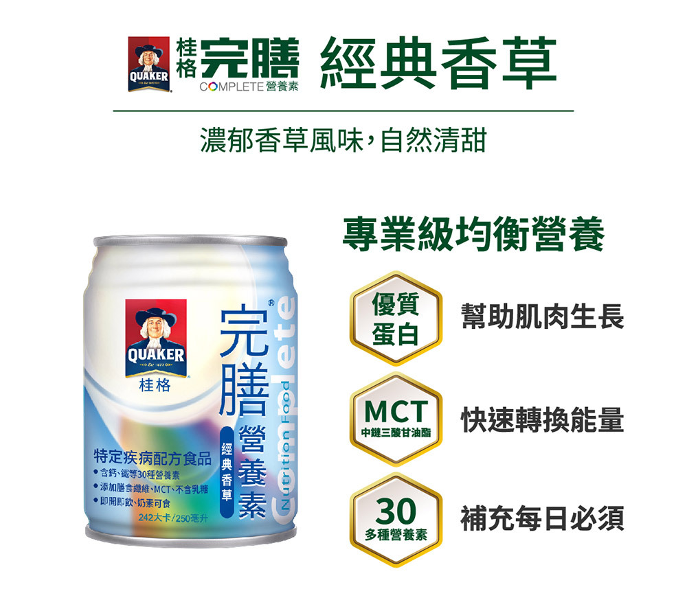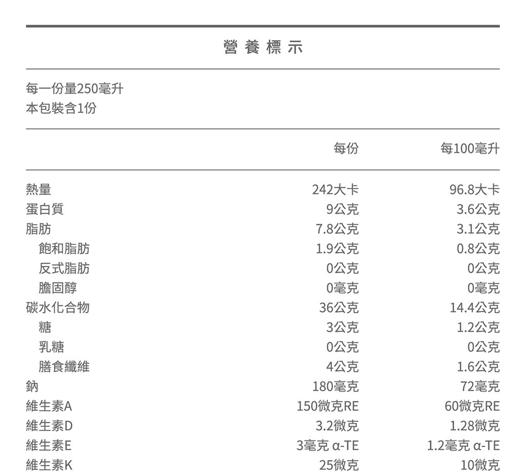 | 成分/內容物 | 去離子水、蔗糖、麥芽糊精、乾酪素鈣、麥芽糖漿、難消化性麥芽糊精、芥花油、乾酪素鈉、菊糖(纖維)、MCT(中鏈三酸甘油酯)、葵花油、大豆油、檸檬酸鉀、磷酸鎂、碳酸鈣、氯化鈉、乳化劑(單及雙脂肪酸甘油二乙醯酒石酸酯)、氯化膽生僉、香料、磷酸氫二鉀、維生素C、濃縮乳清蛋白、分離大豆蛋白、鹿角菜膠、L-肉酸、牛磺酸、硫酸亞鐵、硫酸鋅、維生素E、菸鹼醯胺、阿拉伯膠、本多酸鈣、硫酸錳、硫酸銅、玉米澱粉、維生素B6、維生素B2、維生素B1、維生素A、葉酸、刺梧桐膠、三氯化鉻、碘化鉀、亞硒酸鈉、維生素K1、鉬酸鈉、生物素、維生素D3、維生素B12 |
