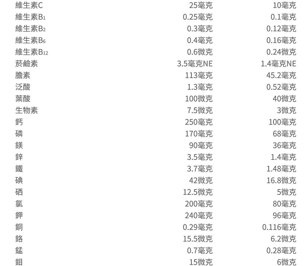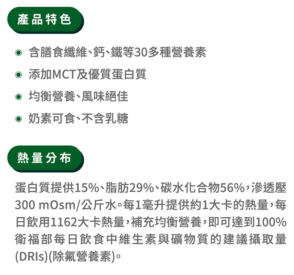 .每日飲用1162大卡熱量,補充均衡營養,即可達到100%衛福部每日飲食中維生素與礦物質建議攝取量(DRIs)(除氟營養素)