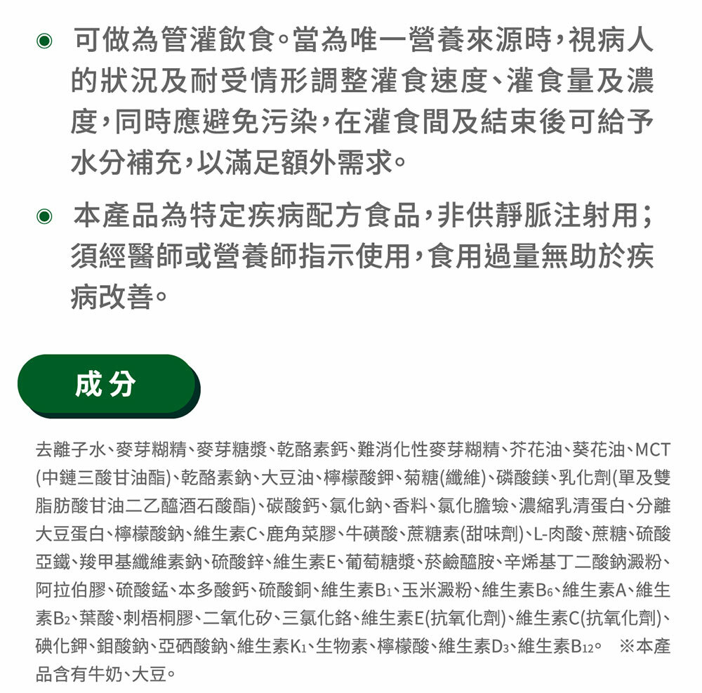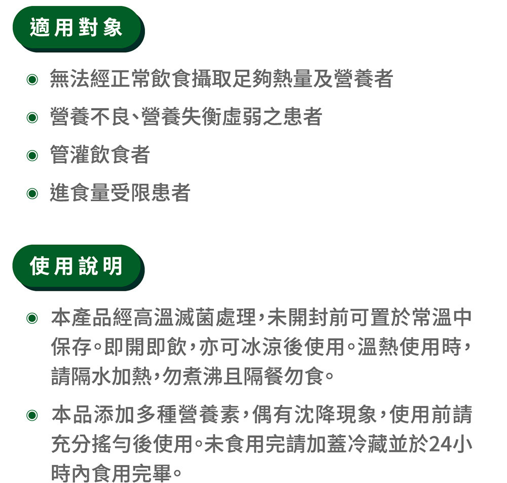 .適用對象: 無法經正常飲食攝取足夠熱量及營養者、營養不良或失衡虛弱之患者、管灌飲食者、進食量受限患者