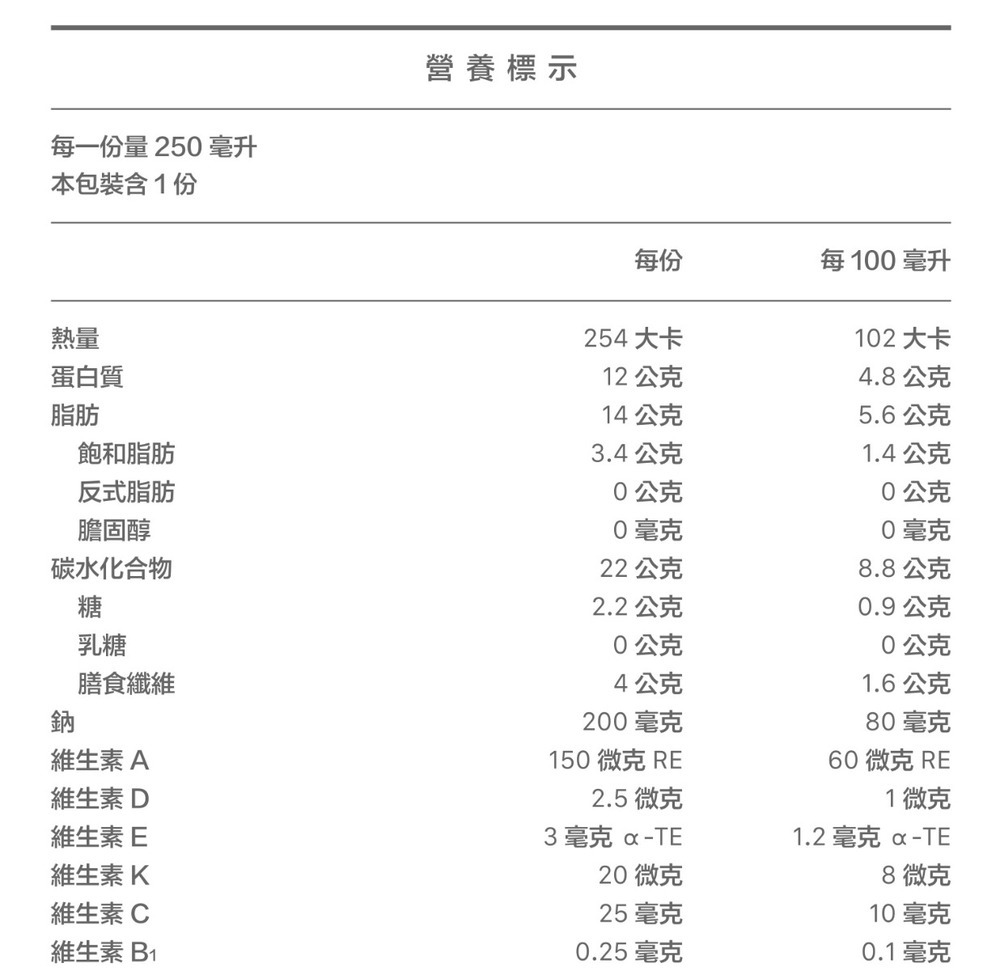 | 成分/內容物 | 去離子水、麥芽糊精、乾酪素鈣、芥花油、麥芽糖漿、難消化性麥芽糊精、MCT(中鏈三酸甘油酯)、葵花油、大豆油、乾酪素鈉、菊糖(纖維)、乳化劑(單及雙脂肪酸甘油二乙醯酒石酸酯)、檸檬酸鉀、磷酸鎂、氯化鈉、氯化膽生僉、香料、碳酸鈣、肌醇、磷酸氫二鉀、維生素C、濃縮乳清蛋白、分離大豆蛋白、碳酸氫鈉、鹿角菜膠、L-肉酸、牛磺酸、蔗糖、蔗糖素(甜味劑)、硫酸亞鐵、硫酸鋅、維生素E、菸鹼醯胺、阿拉伯膠、硫酸錳、本多酸鈣、硫酸銅、玉米澱粉、維生素B6、維生素B2、維生素B1、吡啶甲酸鉻、維生素A、葉酸、刺梧桐膠、三氯化鉻、碘化鉀、亞硒酸鈉、維生素K1、鉬酸鈉、生物素、維生素D3、維生素B12 |