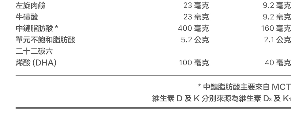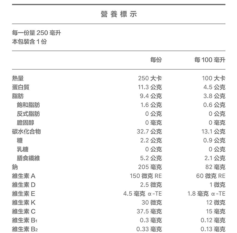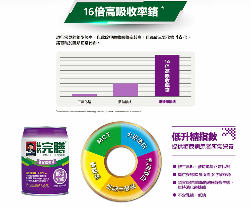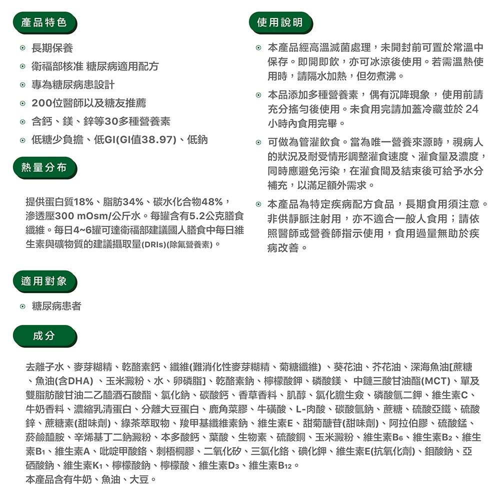 | 成分/內容物 | 糖尿病 100鉻無糖配方:去離子水、麥芽糊精、乾酪素鈣、纖維(難消化性麥芽糊精、菊糖)、芥花油、葵花油、乾酪素鈉、檸檬酸鉀、磷酸鎂、中鏈三酸甘油酯 (MCT)、單及雙脂肪酸甘油二乙醯酒石酸酯、氯化鈉、碳酸鈣、香草香料、肌醇、氯化膽生僉、磷酸氫二鉀、維生素C、牛奶香料、分離大豆蛋白、濃縮乳清蛋白、脂肪酸蔗糖酯、結蘭膠、牛磺酸、L-肉酸、碳酸氫鈉、金盞花萃取物[大豆油、類胡蘿蔔素(含葉黃素)]、硫酸亞鐵、硫酸鋅、羧甲基纖維素鈉、鹿角菜膠、維生素E、菸鹼醯胺、蔗糖、阿拉伯膠、辛烯基丁二酸鈉澱粉、硫酸錳、綠茶萃取物(含EGCG)、本多酸鈣、葡萄萃取物[環狀糊精、葡萄萃取物(含白藜蘆醇)]、硫酸銅、玉米澱粉、吡啶甲酸鉻、維生素B6、維生素B2、維生素B1、維生素A、葉酸、刺梧桐膠、二氧化矽、三氯化鉻、碘化鉀、維生素E (抗氧化劑)、鉬酸鈉、亞硒酸鈉、維生素K1、檸檬酸鈉、生物素、檸檬酸、維生素D3、維生素B12。 糖尿病低糖:去離子水、麥芽糊精、乾酪素鈣、纖維(難消化性麥芽糊精、菊糖纖維)、葵花油、芥花油、深海魚油[蔗糖、魚油(含DHA)、玉米澱粉、水、卵磷脂]、乾酪素鈉、檸檬酸鉀、磷酸鎂、中鏈三酸甘油酯 (MCT)、單及雙脂肪酸甘油二乙醯酒石酸酯、氯化鈉、碳酸鈣、香草香料、肌醇、氯化膽生僉、磷酸氫二鉀、維生素C、牛奶香料、濃縮乳清蛋白、分離大豆蛋白、鹿角菜膠、牛磺酸、L-肉酸、碳酸氫鈉、蔗糖、硫酸亞鐵、硫酸鋅、蔗糖素(甜味劑)、綠茶萃取物、羧甲基纖維素鈉、維生素E、甜菊醣苷(甜味劑)、阿拉伯膠、硫酸錳、菸鹼醯胺、辛烯基丁二酸鈉澱粉、本多酸鈣、葉酸、生物素、硫酸銅、玉米澱粉、維生素B6、維生素B2、維生素B1、維生素A、吡啶甲酸鉻、刺梧桐膠、二氧化矽、三氯化鉻、碘化鉀、維生素E(抗氧化劑)、鉬酸鈉、亞硒酸鈉、維生素K1、檸檬酸鈉、檸檬酸、維生素D3、維生素B12。 |