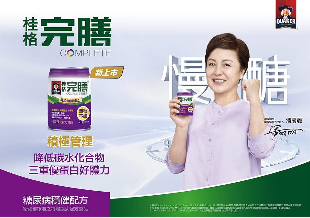 *根據NielsenIQ 2023 MAT 五月太完市場調查資料顯示,桂格完膳糖尿病配方於成人營養補充銀品中糖尿病類別連續三年銷量最高
