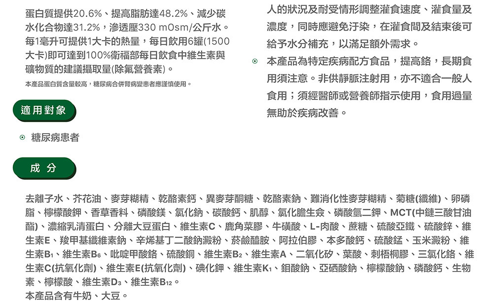 | 成分/內容物 | 去離子水、芥花油、麥芽糊精、乾酪素鈣、異麥芽酮糖、乾酪素鈉、難消化性麥芽糊精、菊糖(纖維)、卵磷脂、檸檬酸鉀、香草香料、磷酸鎂、氯化鈉、碳酸鈣、肌醇、氯化膽生僉、磷酸氫二鉀、MCT(中鏈三酸甘油脂)、濃縮乳清蛋白、分離大豆蛋白、維生素C、鹿角菜膠、牛磺酸、L-肉酸、蔗糖、硫酸亞鐵、硫酸鋅、維生素E、羧甲基纖維素鈉、辛烯基丁二酸鈉澱粉、菸鹼醯胺、阿拉伯膠、本多酸鈣、硫酸錳、玉米澱粉、維生素B1、維生素B6、吡啶甲酸鉻、硫酸銅、維生素B2、維生素A、二氧化矽、葉酸、刺梧桐膠、三氯化鉻、維生素C(抗氧化劑)、維生素E(抗氧化劑)、碘化鉀、維生素K1、鉬酸鈉、亞硒酸鈉、檸檬酸鈉、磷酸鈣、生物素、檸檬酸、維生素D3、維生素B12。本產品含有牛奶、大豆。 |