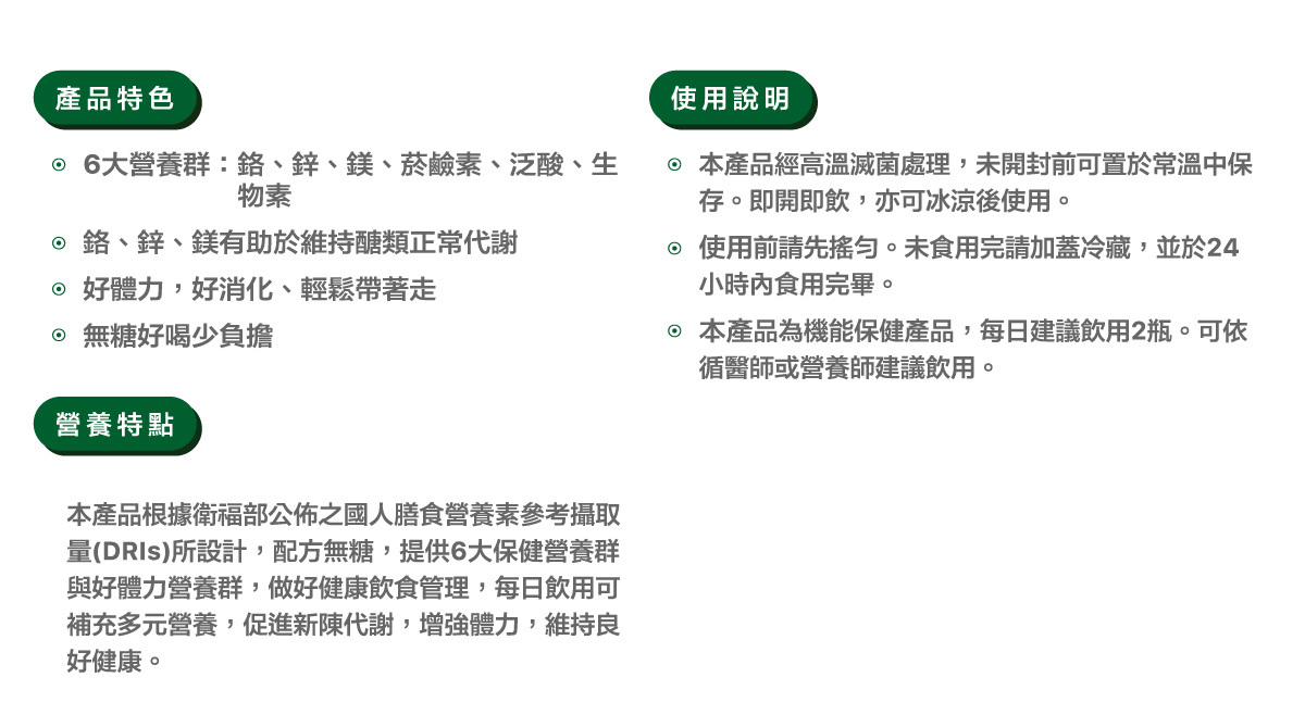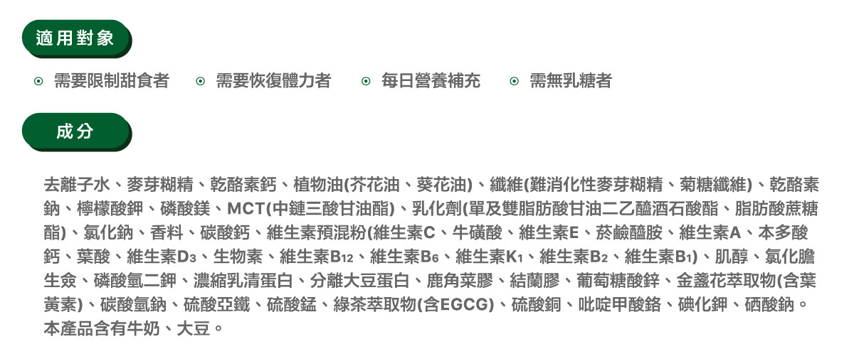 .適用對象:需要限制甜食者、需要恢復體力者、每日營養補充、不耐乳糖者