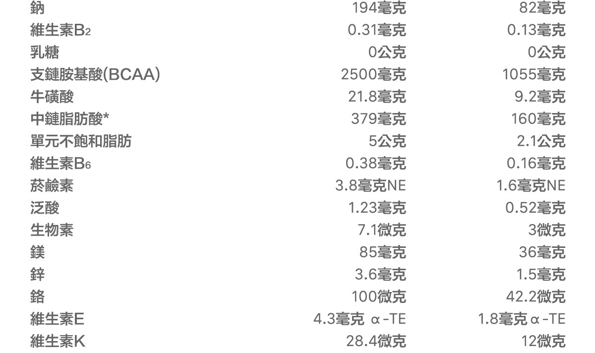.好體力營養群:MCT、維生素B2、維生素B6、BCAA、牛磺酸