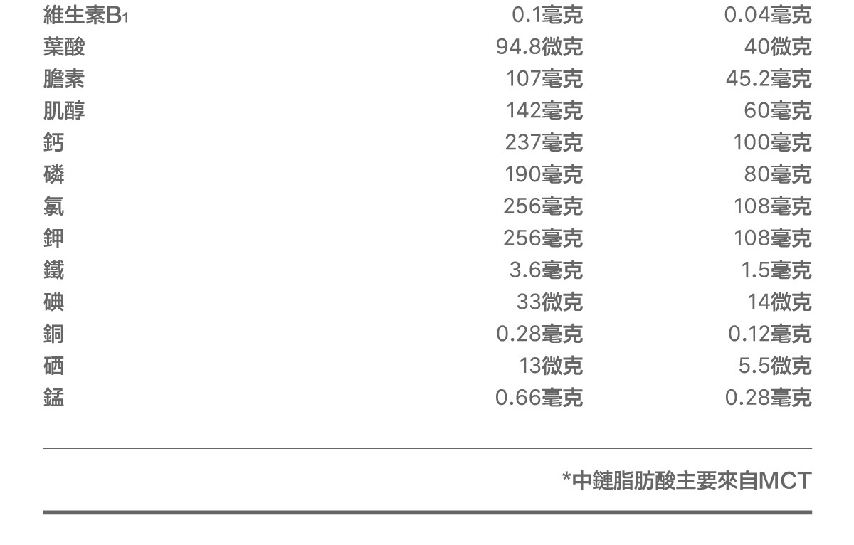 | 成分/內容物 | 去離子水、麥芽糊精、乾酪素鈣、植物油(芥花油、葵花油)、纖維(難消化性麥芽糊精、菊糖纖維)、乾酪素鈉、檸檬酸鉀、磷酸鎂、MCT(中鏈三酸甘油酯)、乳化劑(單及雙脂肪酸甘油二乙醯酒石酸酯、脂肪酸蔗糖酯)、氯化鈉、香料、碳酸鈣、維生素預混粉(維生素C、牛磺酸、維生素E、菸鹼醯胺、維生素A、本多酸鈣、葉酸、維生素D3、生物素、維生素B12、維生素B6、維生素K1、維生素B2、維生素B1)、肌醇、氯化膽生僉、磷酸氫二鉀、濃縮乳清蛋白、分離大豆蛋白、鹿角菜膠、結蘭膠、葡萄糖酸鋅、金盞花萃取物(含葉黃素)、碳酸氫鈉、硫酸亞鐵、硫酸錳、綠茶萃取物(含EGCG)、硫酸銅、吡啶甲酸鉻、碘化鉀、硒酸鈉 |
