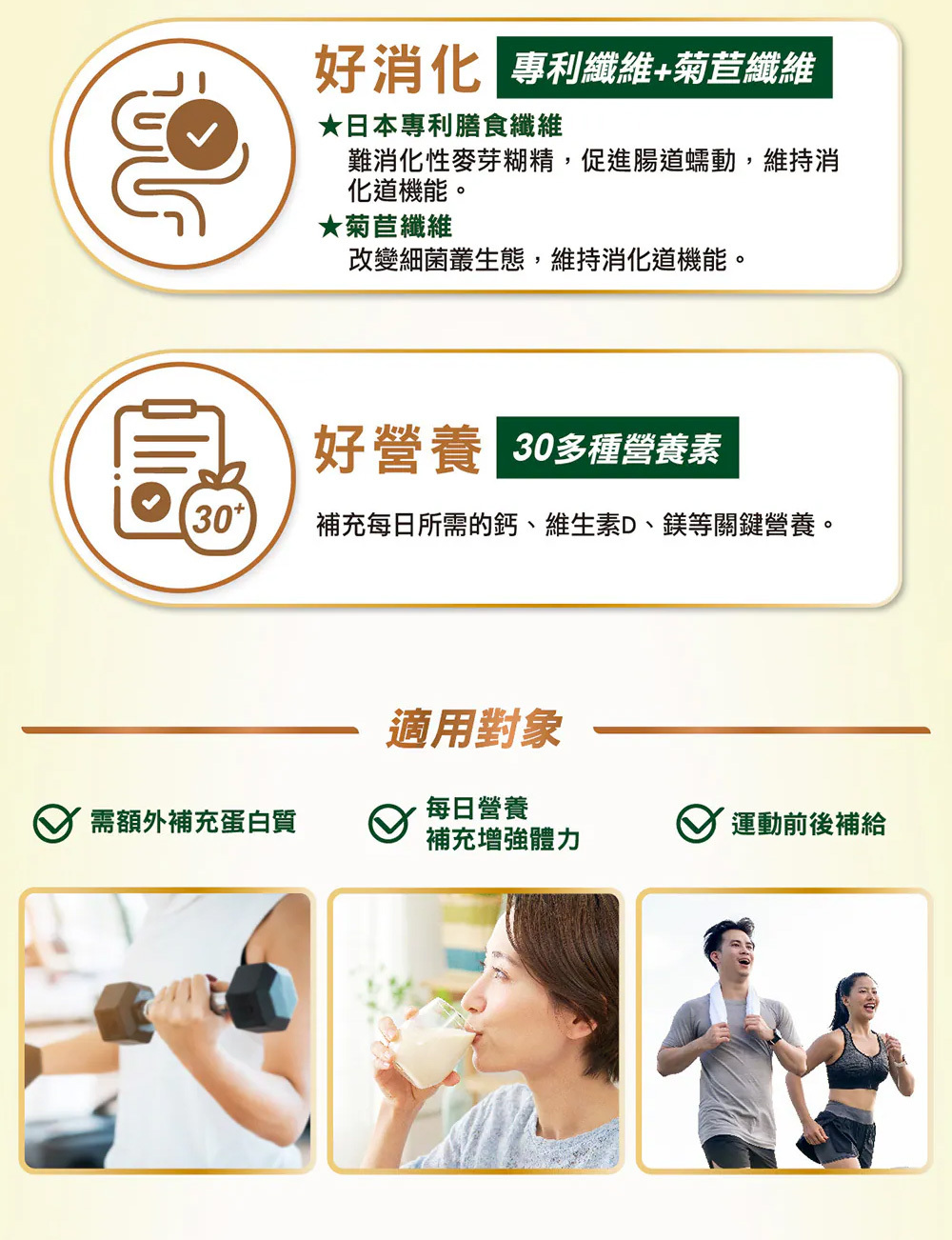 .適用對象: 注重每日蛋白質攝取者、需增強體力者、運動前後補給,建議成年以上飲用