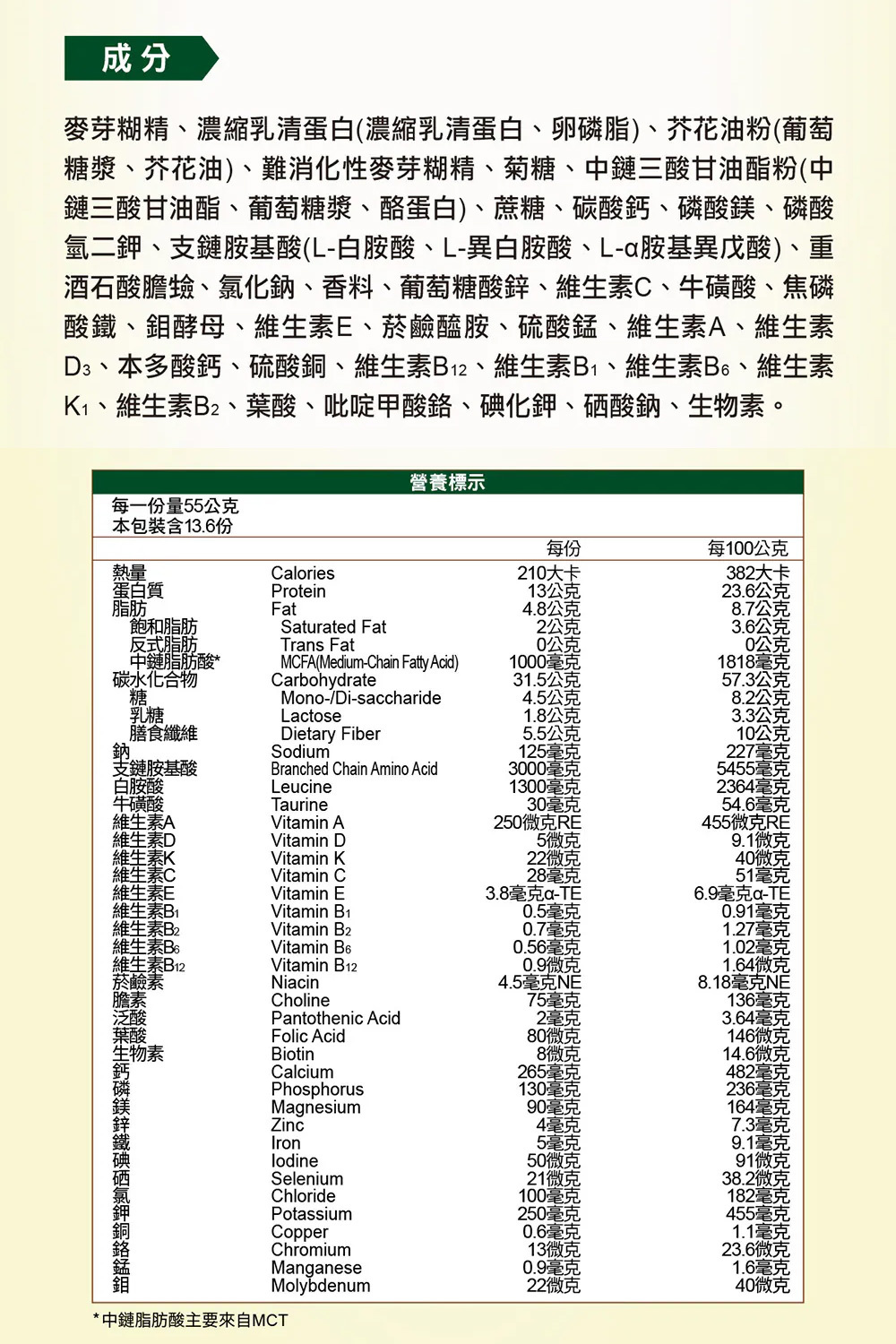 | 成分/內容物 | 麥芽糊精、濃縮乳清蛋白(濃縮乳清蛋白、卵磷脂)、芥花油粉(葡萄糖漿、芥花油)、難消化性麥芽糊精、菊糖、中鏈三酸甘油酯粉(中鏈三酸甘油酯、葡萄糖漿、酪蛋白)、蔗糖、碳酸鈣、磷酸鎂、磷酸氫二鉀、支鏈胺基酸(L-白胺酸、L-異白胺酸、L-α胺基異戊酸)、重酒石酸膽生僉、氯化鈉、香料、葡萄糖酸鋅、維生素C、牛磺酸、焦磷酸鐵、鉬酵母、維生素E、菸鹼醯胺、硫酸錳、維生素A、維生素D3、本多酸鈣、硫酸銅、維生素B12、維生素B1、維生素B6、維生素K1、維生素B2、葉酸、吡啶甲酸鉻、碘化鉀、硒酸鈉、生物素 *本產品含牛奶,大豆 |