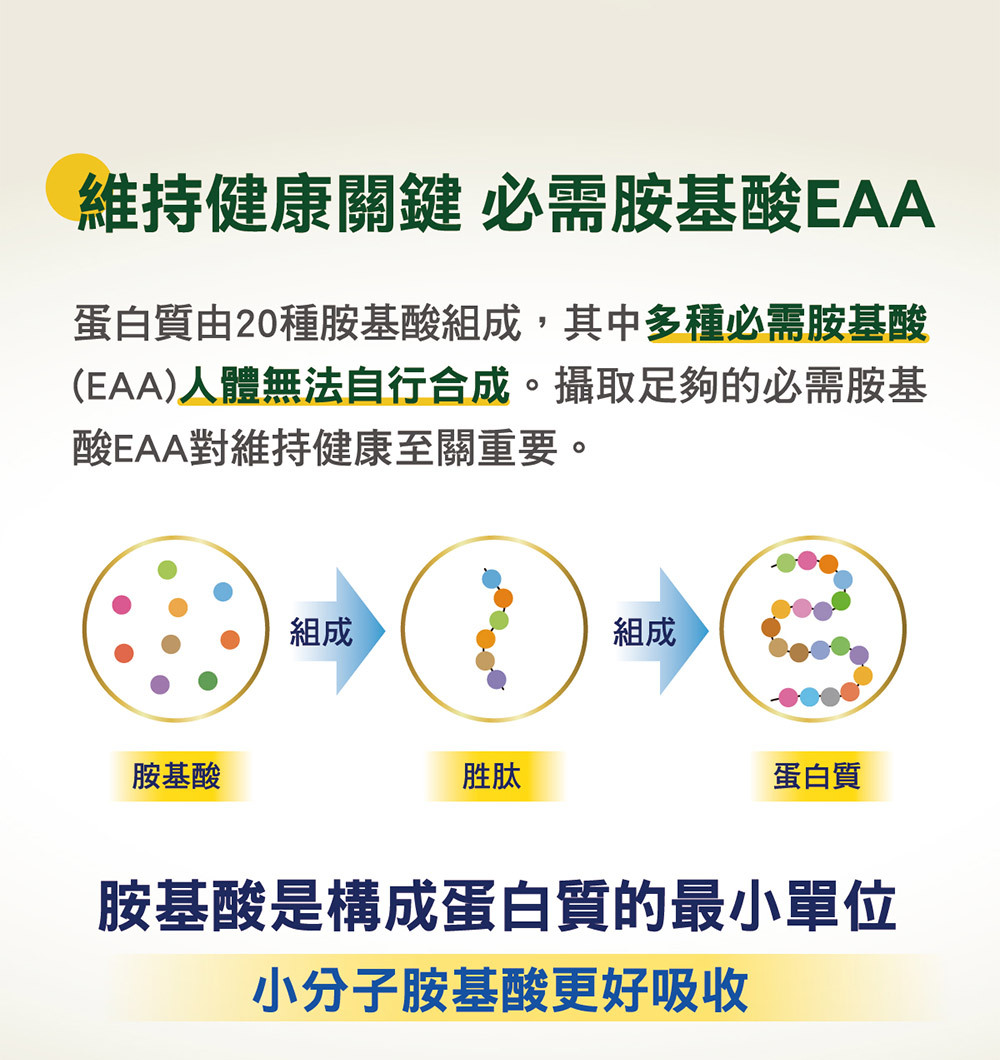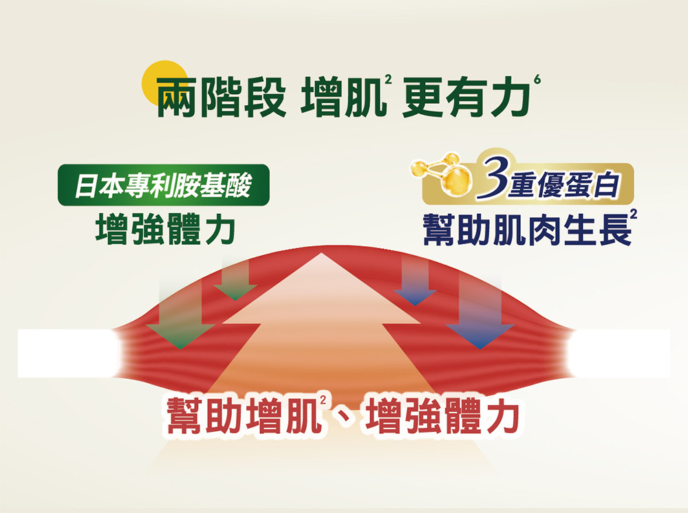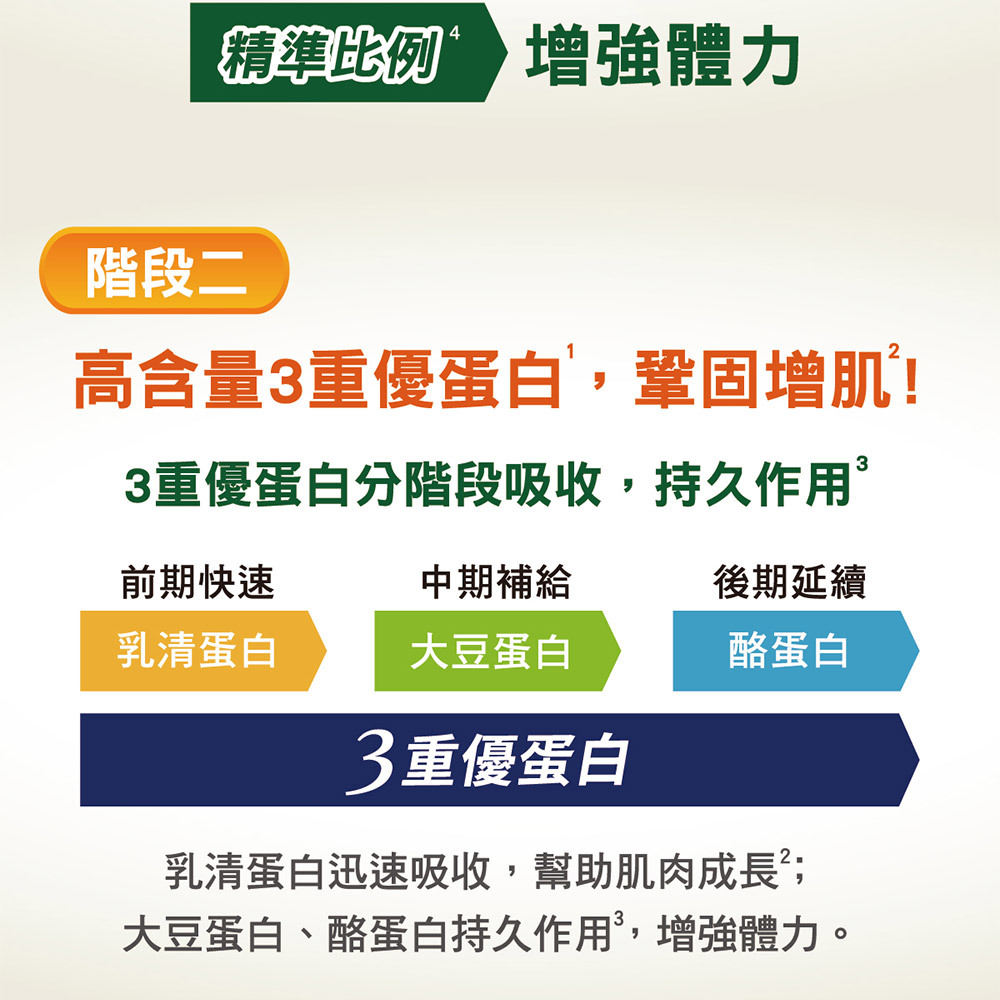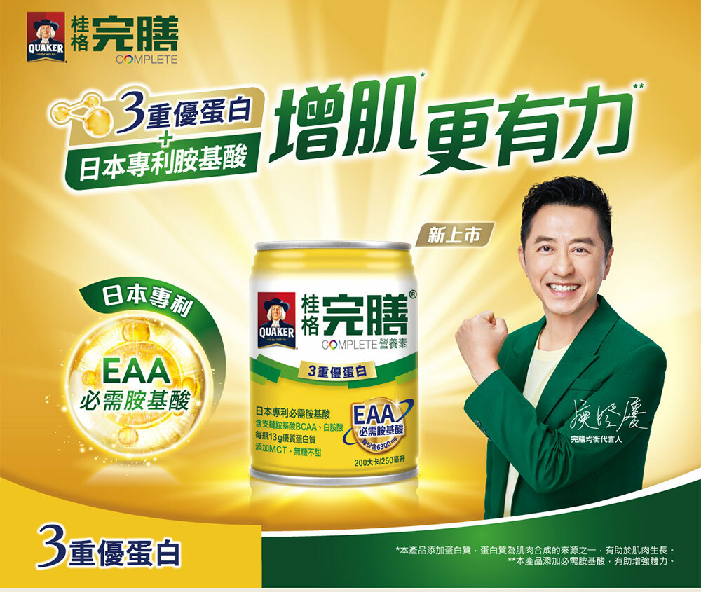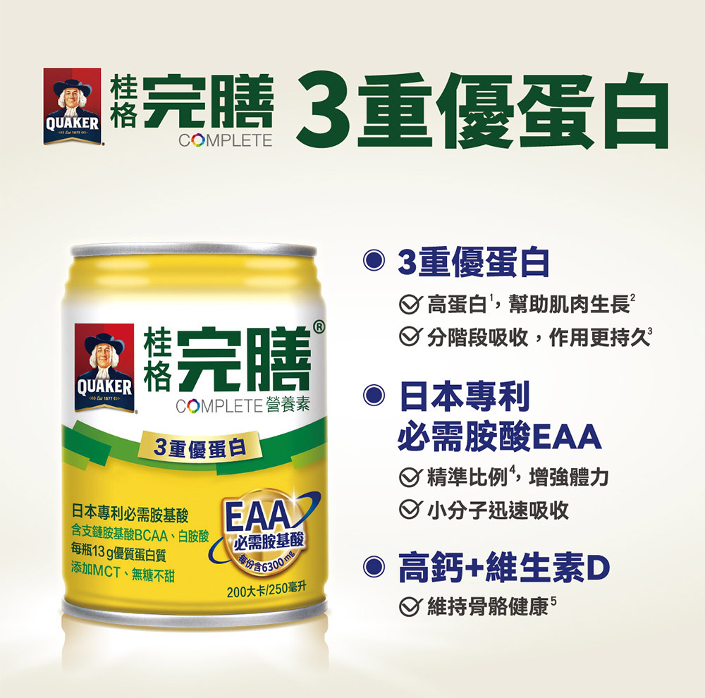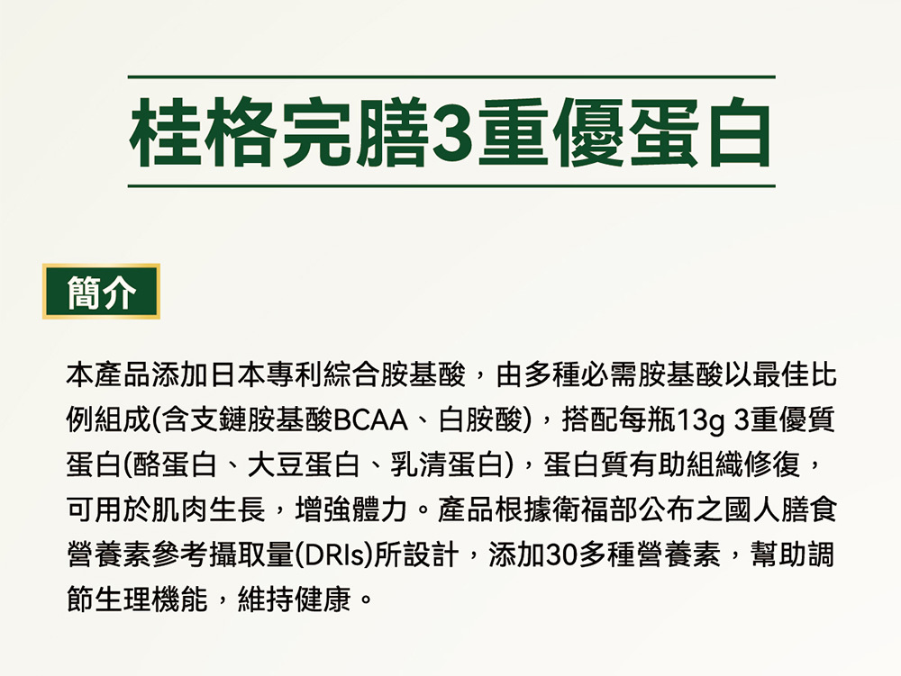 桂格完膳營養素3重優蛋白,添加日本專利綜合胺基酸,由多種必需胺基酸以最佳比例組成(含支鏈胺基酸BCAA、白胺酸),搭配3重優質蛋白質(酪蛋白、大豆蛋白、乳清蛋白),蛋白質有助組織修復,可用於肌肉生長,增強體力。