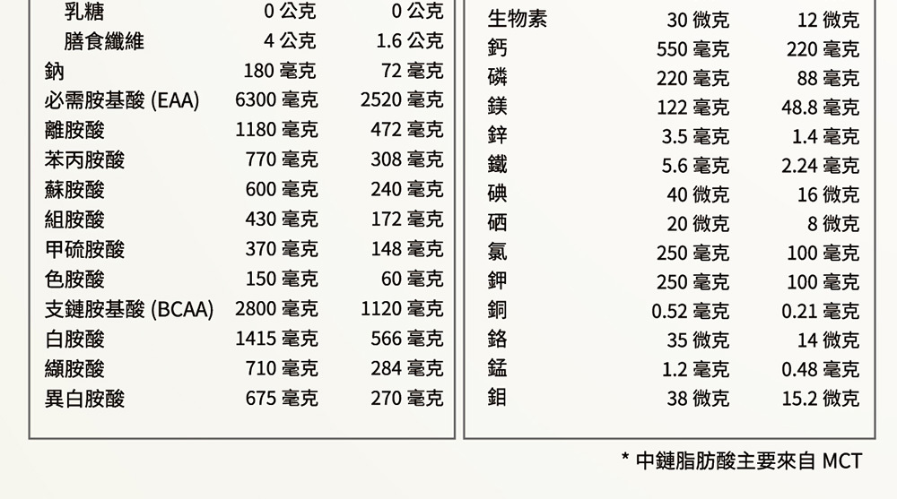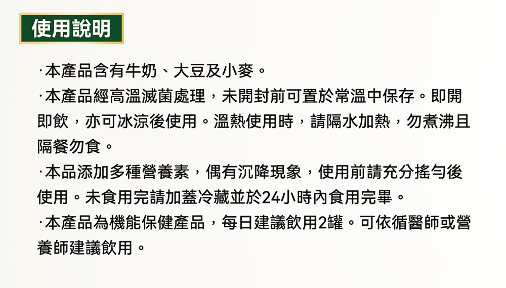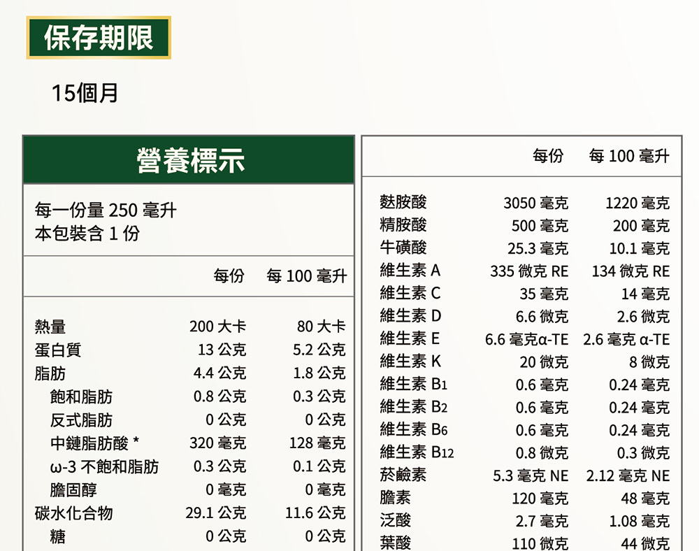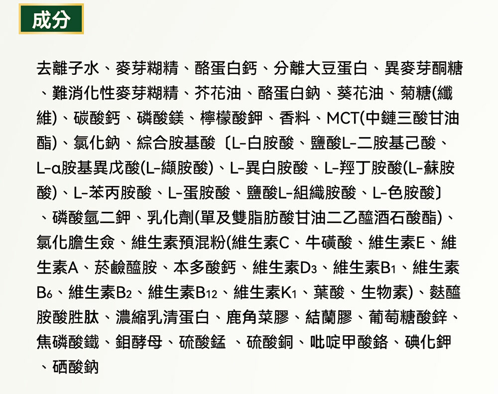 | 成分/內容物 | 去離子水、麥芽糊精、酪蛋白鈣、分離大豆蛋白、異麥芽酮糖、難消化性麥芽糊精、芥花油、酪蛋白鈉、葵花油、菊糖(纖維)、碳酸鈣、磷酸鎂、檸檬酸鉀、香料、MCT(中鏈三酸甘油酯)、氯化鈉、綜合胺基酸 [L-白胺酸、鹽酸L-二胺基己酸、L-α胺基異戊酸(L-纈胺酸)、L-異白胺酸、L-羥丁胺酸(L-蘇胺酸)、L-苯丙胺酸、L-蛋胺酸、鹽酸L-組織胺酸、L-色胺酸]、磷酸氫二鉀、乳化劑(單及雙脂肪酸甘油二乙醯酒石酸酯)、氯化膽生僉、維生素預混粉(維生素C、牛磺酸、維生素E、維生素A、菸鹼醯胺、本多酸鈣、維生素D3、維生素B1、維生素B6、維生素B2、維生素B12、維生素K1、葉酸、生物素)、麩醯胺酸胜肽、濃縮乳清蛋白、鹿角菜膠、結蘭膠、葡萄糖酸鋅、焦磷酸鐵、鉬酵母、硫酸錳、硫酸銅、吡啶甲酸鉻、碘化鉀、硒酸鈉 |